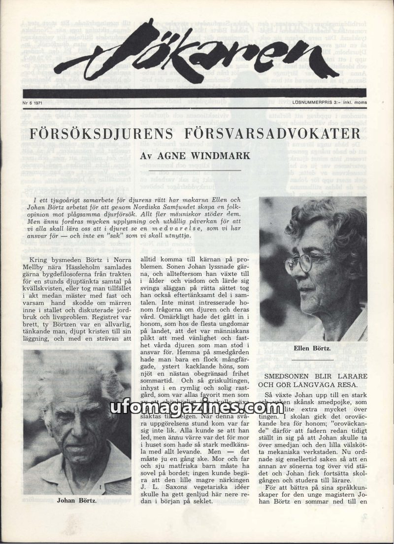 This issue of Sökaren magazine features several in-depth articles. The lead story highlights the lifelong work of Ellen and Johan Börtz in advocating for animal rights and against