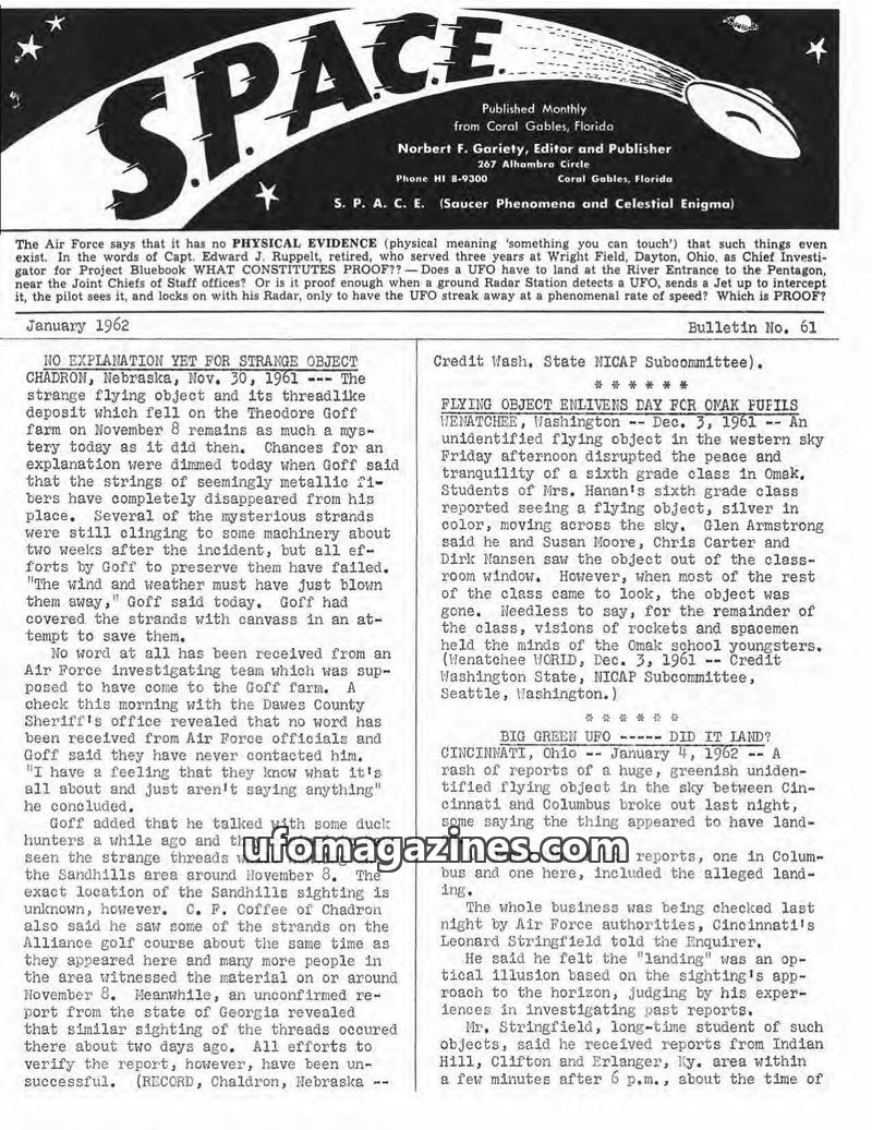 This issue of SPACE magazine covers several UFO sightings, including metallic fibers found in Chadron, Nebraska, a greenish object near Cincinnati, Ohio, and a reported rocket-like