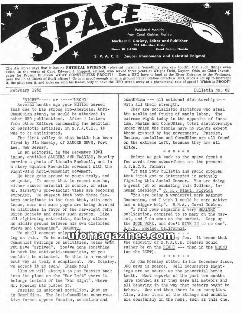 This issue of SPACE magazine, dated February 1962, delves into various topics including UFO reports, political commentary, and scientific theories. The editor, Norbert F. Gariety,