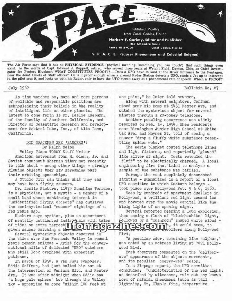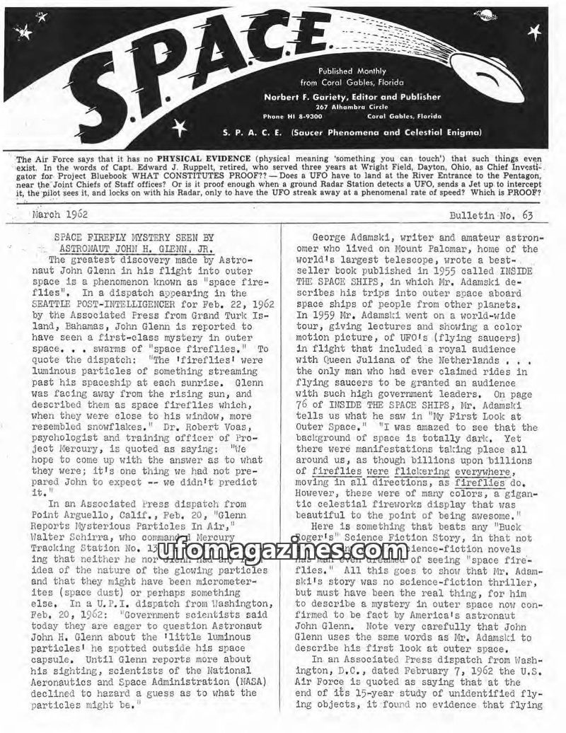 This issue of S.P.A.C.E. magazine focuses on the 'space fireflies' phenomenon reported by astronaut John Glenn, drawing parallels to George Adamski's earlier descriptions. It quest