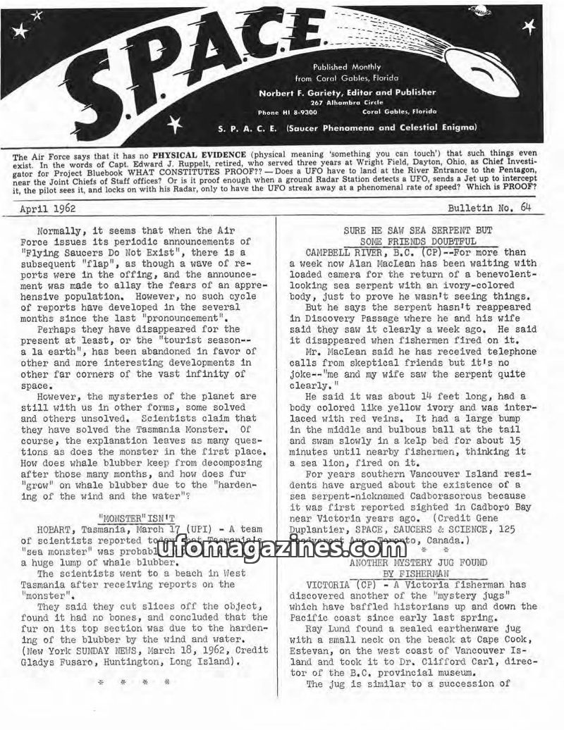 This issue of SPACE magazine covers a range of unexplained phenomena and scientific investigations. It discusses the Air Force's stance on UFO evidence, reports on alleged sea mons