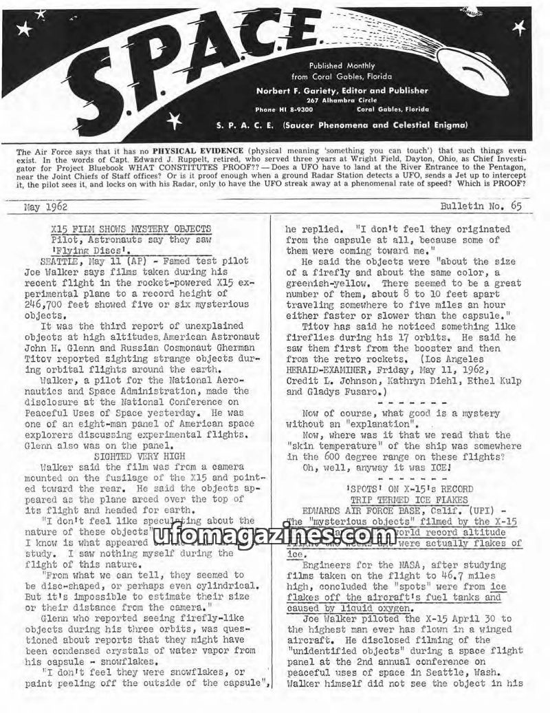 This issue of SPACE magazine from May 1962 reports on the X15 rocket plane's mysterious objects filmed at high altitude, which were later identified as ice flakes. It also details