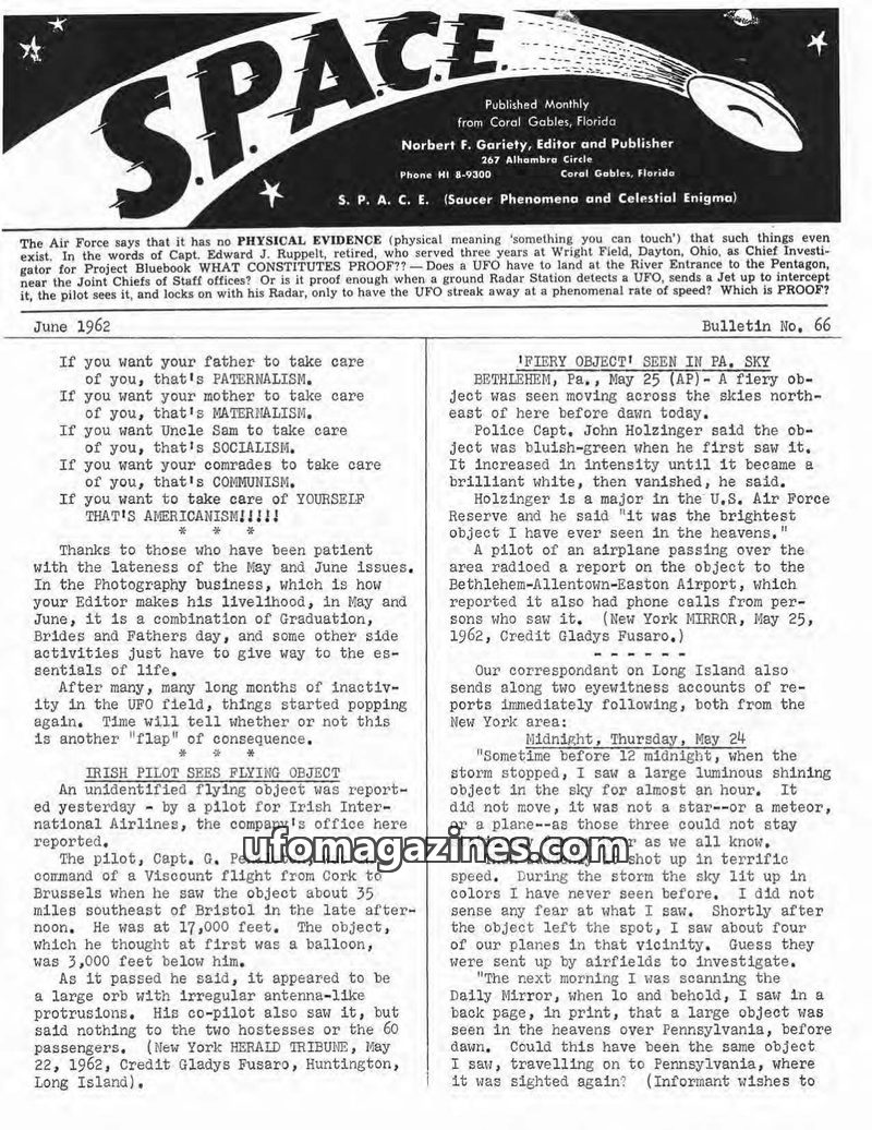 This issue of SPACE magazine covers various UFO sightings reported by pilots and civilians, including an orb seen over Ireland and a fiery object over Pennsylvania. It delves into