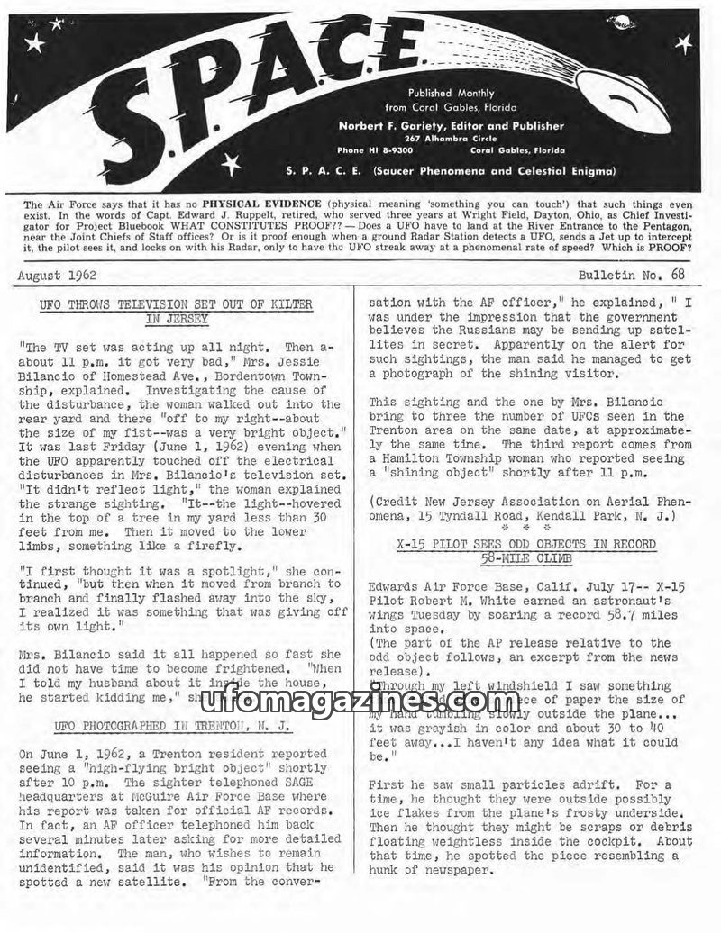 This August 1962 issue of SPACE magazine covers a variety of unusual phenomena. It details a UFO sighting in New Jersey that allegedly disrupted a television set, and reports on an