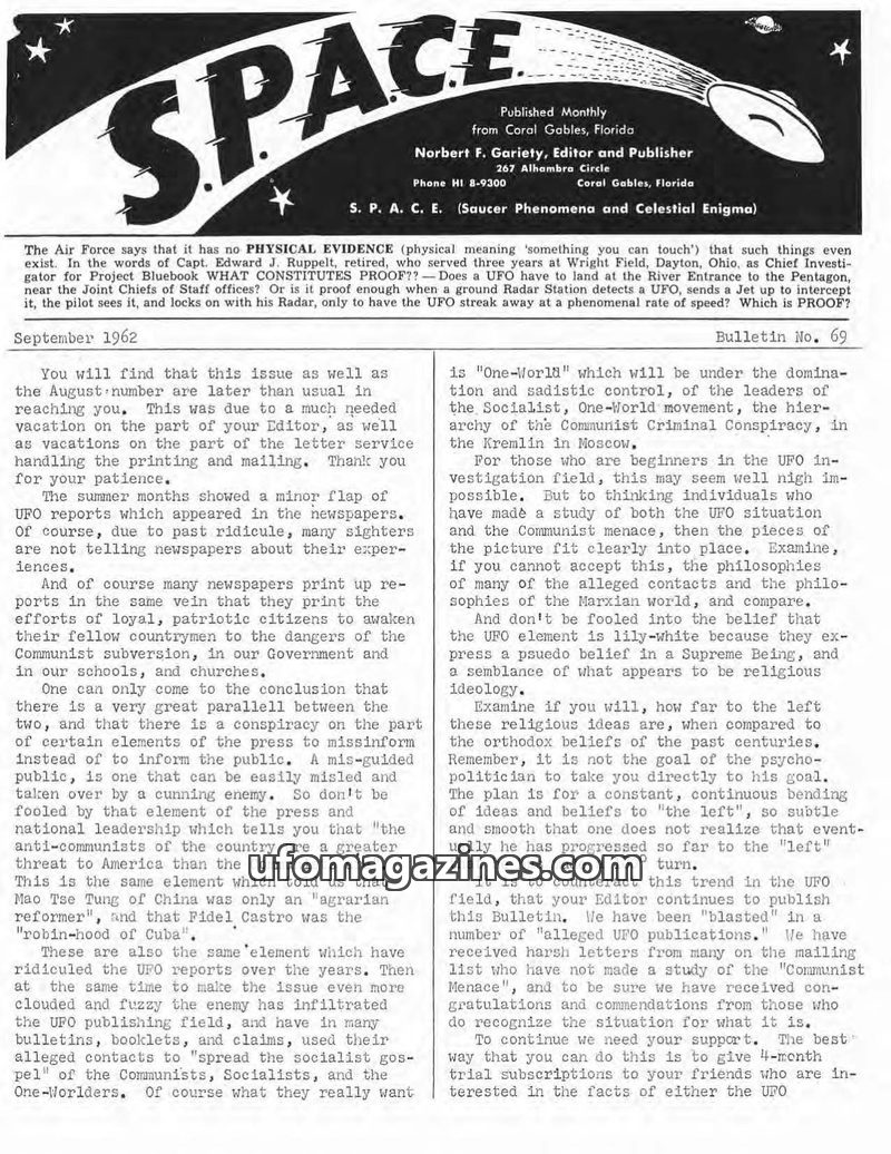This issue of SPACE magazine from September 1962 discusses a perceived 'flap' of UFO reports, linking them to a broader 'Communist conspiracy' and 'One-World' movement. The editor