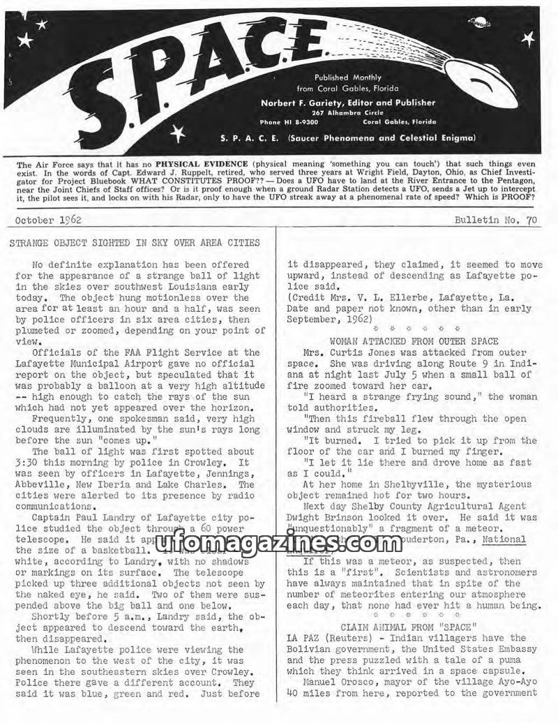 This issue of SPACE Magazine from October 1962 delves into numerous UFO sightings across various locations, including Louisiana, Indiana, Bolivia, and Antarctica. It questions the