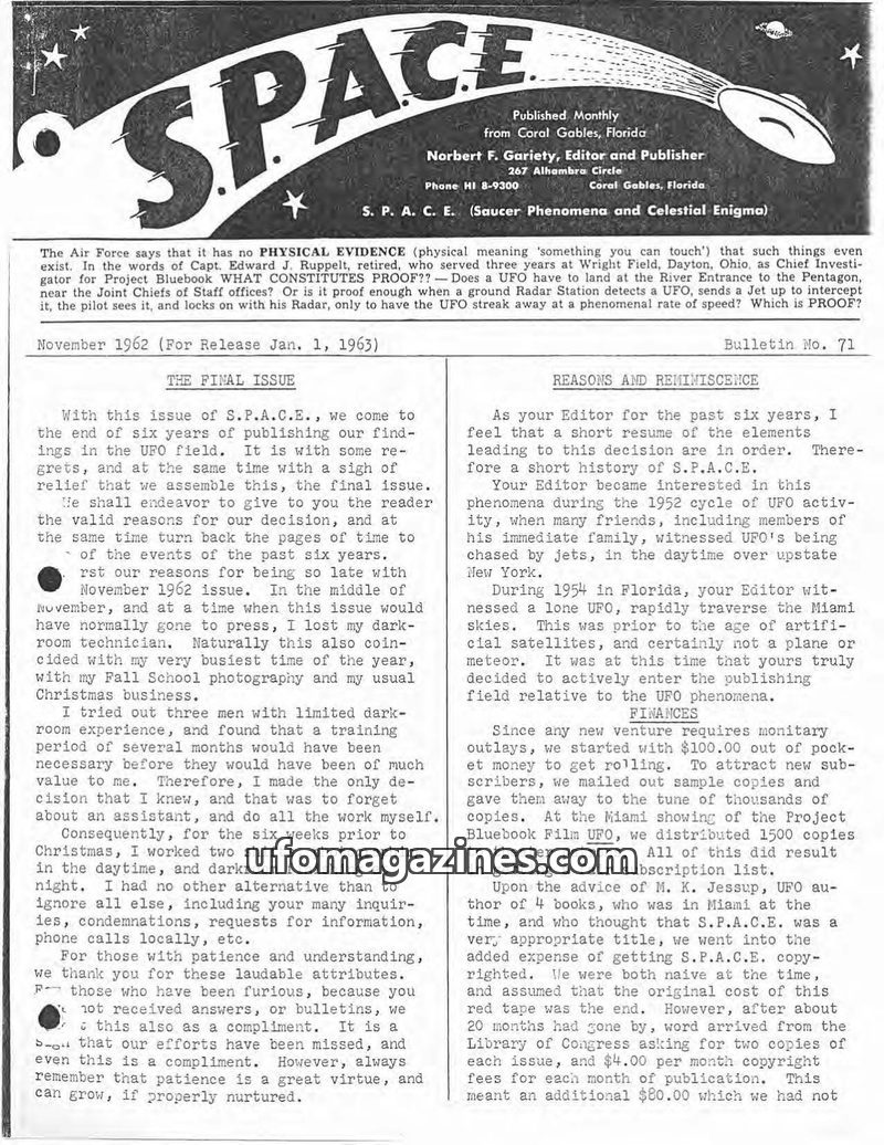 This is the final issue of S.P.A.C.E. magazine after six years of publication. Editor Norbert F. Gariety cites financial difficulties, personal time constraints due to his photogra