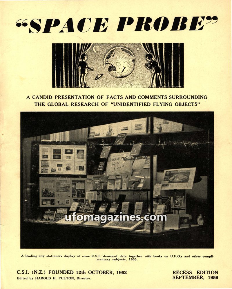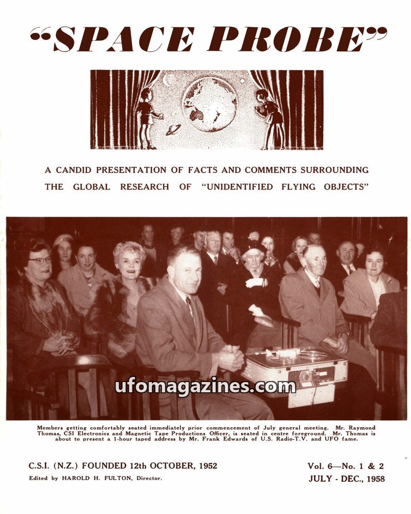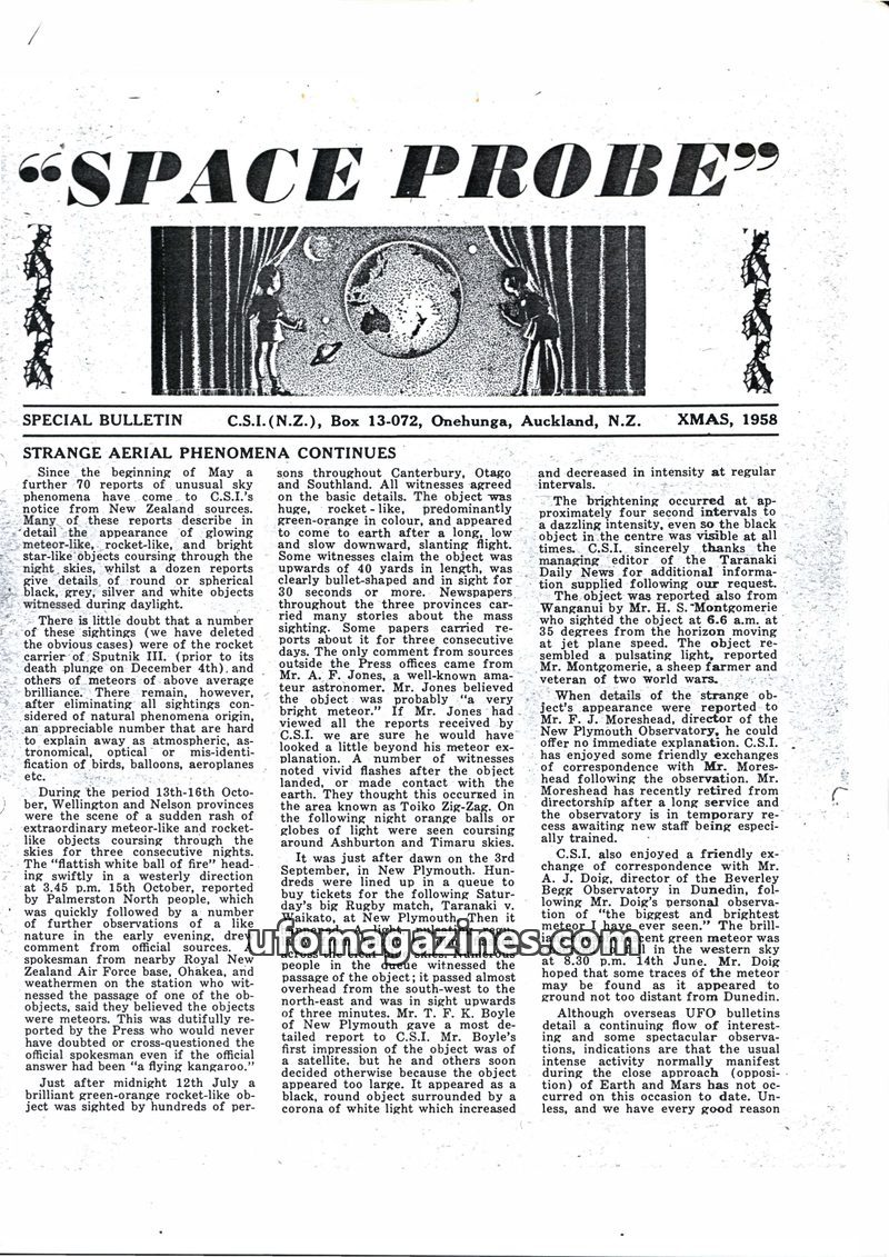 This issue of Space Probe details numerous reports of unusual aerial phenomena in New Zealand during 1958, including sightings of glowing, rocket-like, and spherical objects. The m