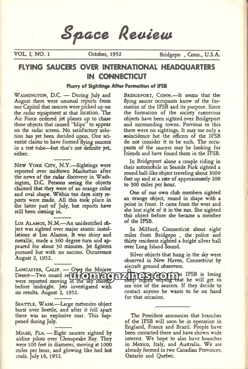 This issue of Space Review, dated October 1952, details a flurry of flying saucer sightings reported across the United States and internationally following the formation of the Int