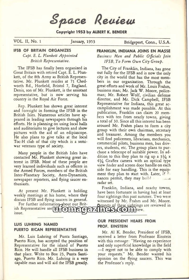 This issue of Space Review details the organization of the International Flying Saucer Bureau (IFSB) in Britain, with Captain E. L. Plunkett appointed as the British Representative