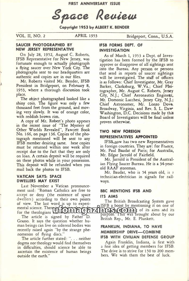 The April 1953 issue of Space Review highlights a photograph of a flying saucer taken by August C. Roberts in New Jersey. It also reports on a Vatican statement suggesting Catholic