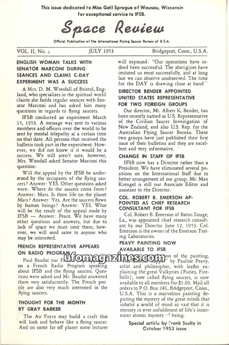 This issue of Space Review from July 1953 covers a range of topics related to flying saucers. It features a report on a spiritualist's claims of communication with Senator Marconi