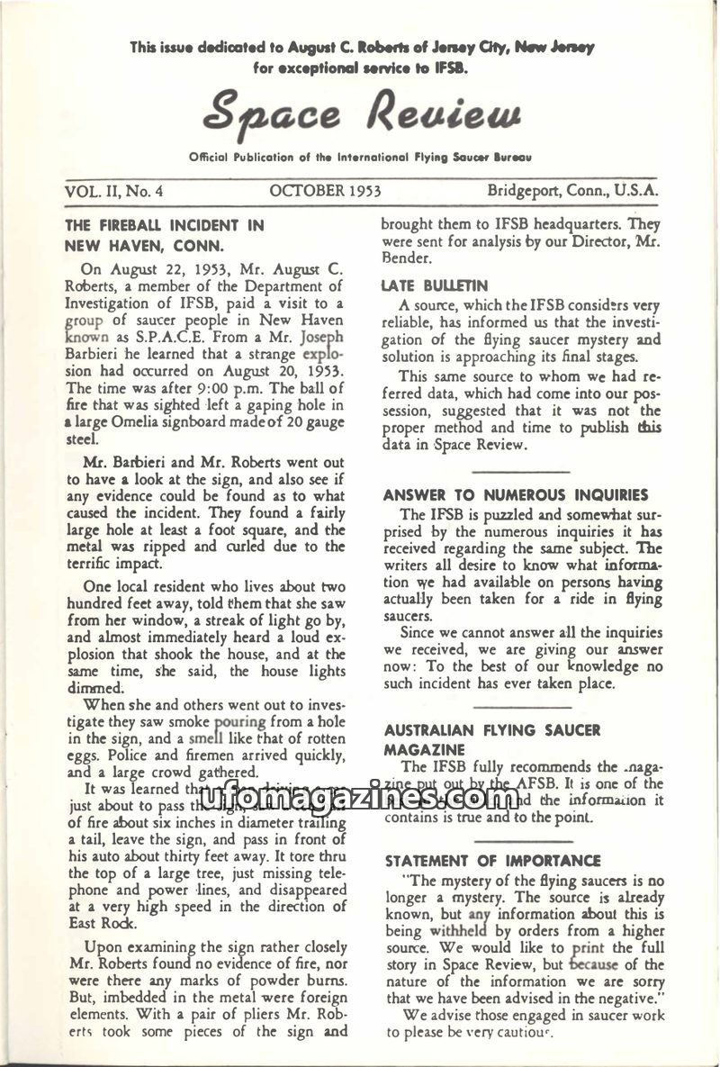 The October 1953 issue of Space Review details the New Haven fireball incident, including witness accounts and physical evidence found on a damaged signboard. It also features an e