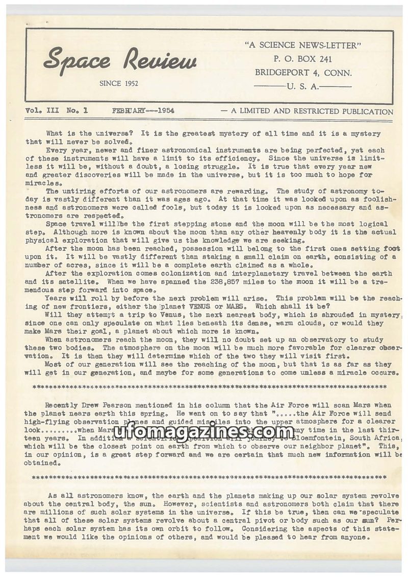 This issue of Space Review from February 1954 delves into the vastness of the universe, the progress of astronomy, and the future of space exploration. It discusses the potential f