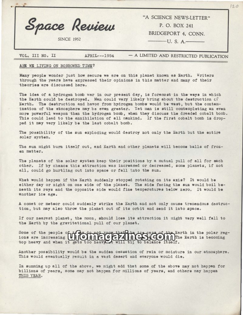 This issue of Space Review from April 1954 discusses various ways Earth could be destroyed, including hydrogen bomb wars, the sun exploding, changes in planetary orbits, a sudden s