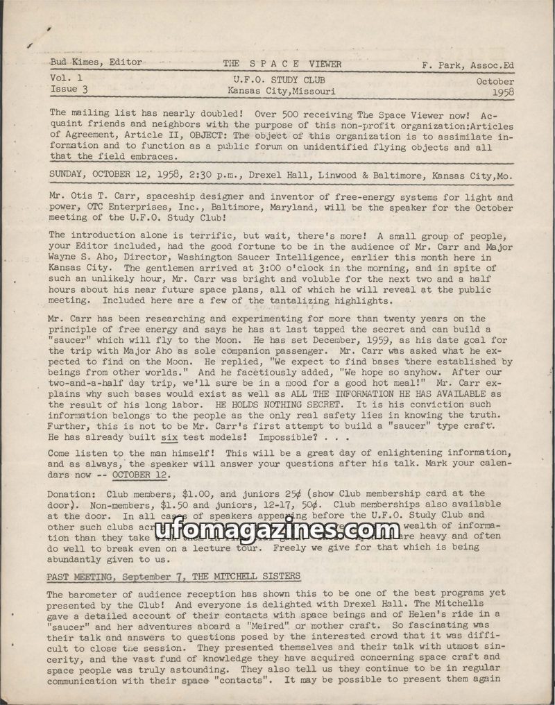 The October 1958 issue of The Space Viewer highlights an upcoming U.F.O. Study Club meeting with Otis T. Carr, a spaceship designer who claims to have developed free-energy systems