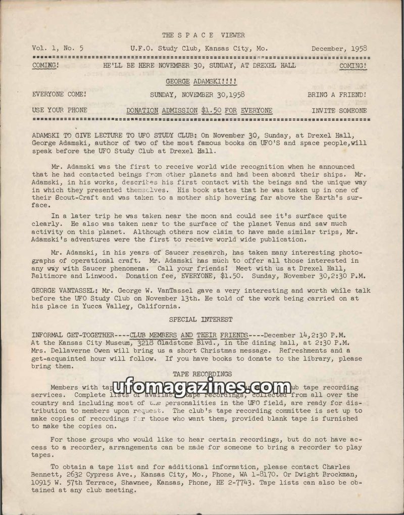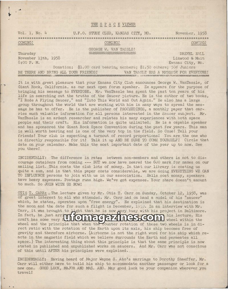 This November 1958 issue of The Space Viewer from the U.F.O. Study Club in Kansas City announces an upcoming lecture by George W. VanTassle, author of 'I Rode A Flying Saucer.' It