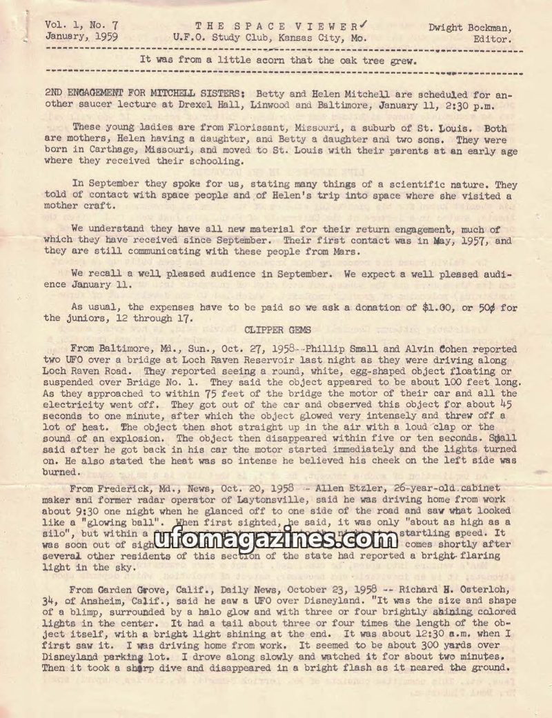 This issue of The Space Viewer from January 1959 details recent UFO sightings, including an egg-shaped object over Loch Raven Reservoir and a blimp-like craft over Disneyland. It a