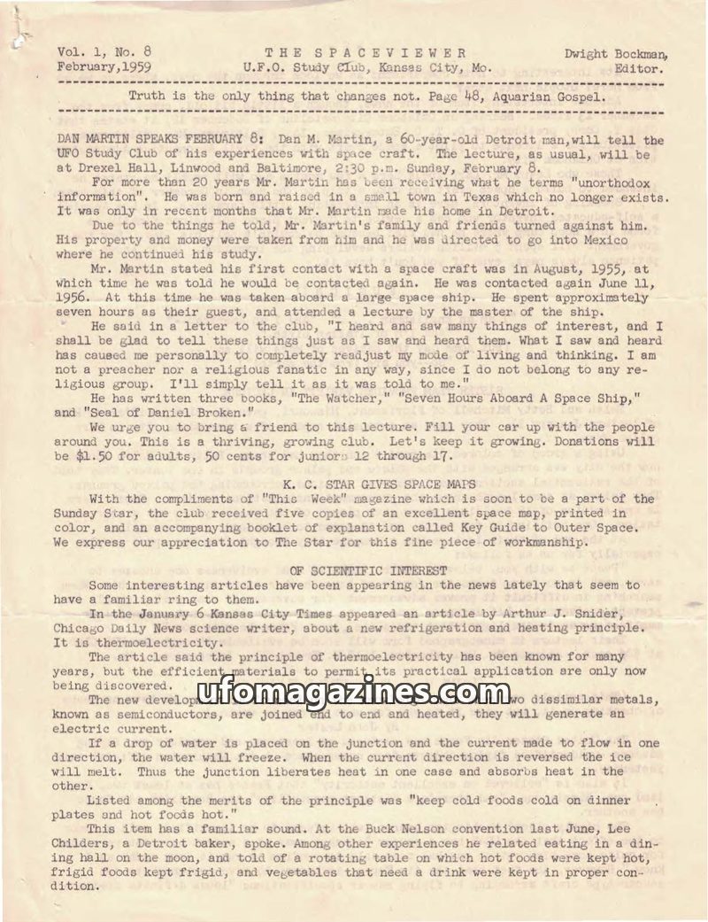 This issue of The Spaceviewer, published by the U.F.O. Study Club in February 1959, features a lecture by Dan Martin detailing his alleged experiences with space craft and extrater