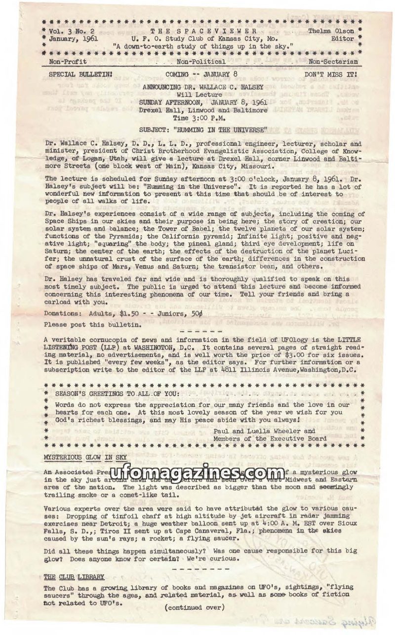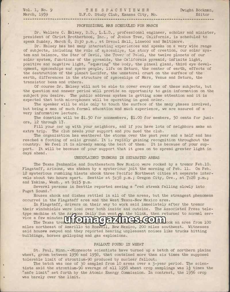 The March 1959 issue of The Spaceviewer covers an upcoming lecture by Dr. Wallace C. Halsey on a wide range of subjects including spaceships and creation. It reports on unexplained