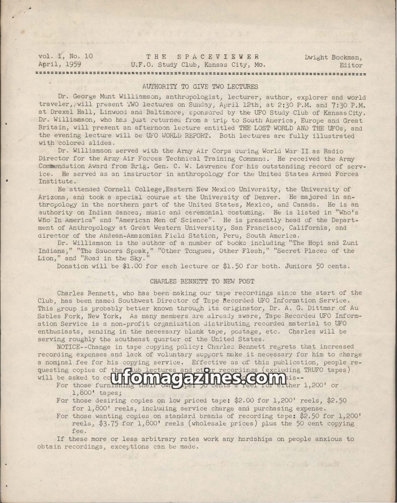 The April 1959 issue of The Spaceviewer highlights upcoming lectures by anthropologist Dr. George Munt Williamson on UFOs and lost worlds. It also details changes in the tape recor