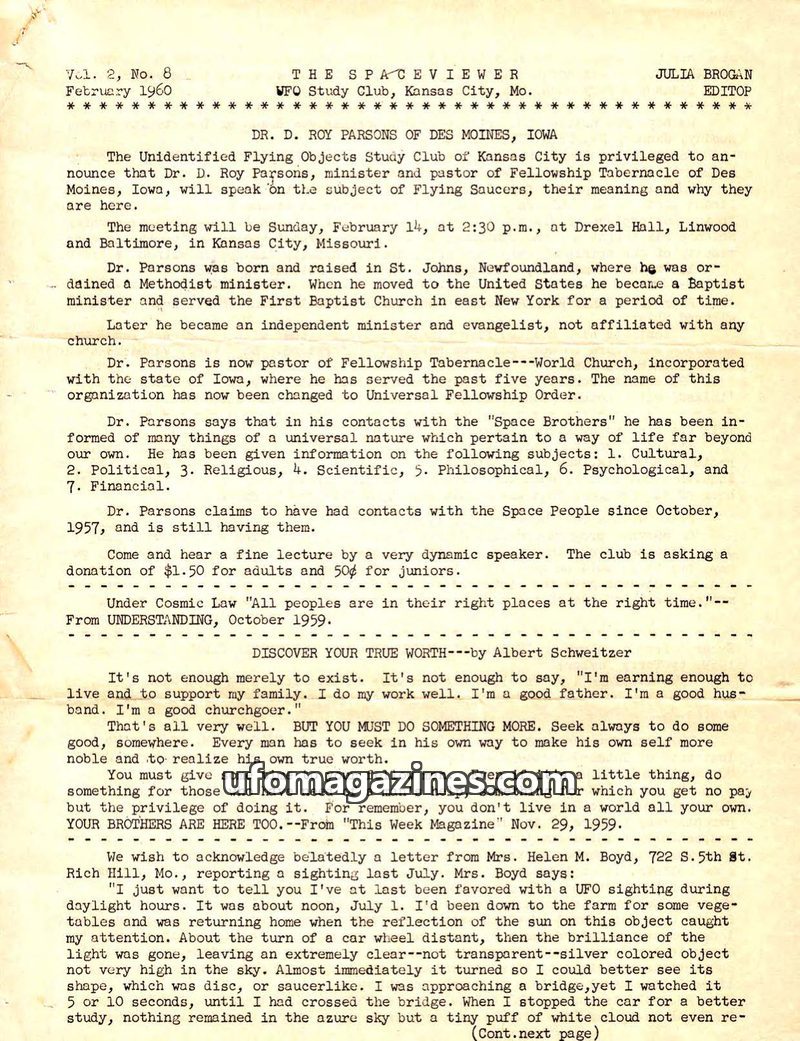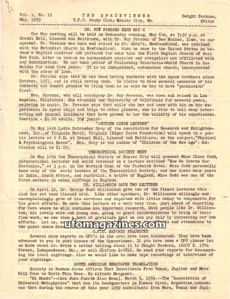 This issue of The Spaceviewer from May 1959 details upcoming lectures by Dr. Roy Parsons, Lydia Schraeder Gray, and Miss Clara Codd in Kansas City. Dr. Parsons claims contact with