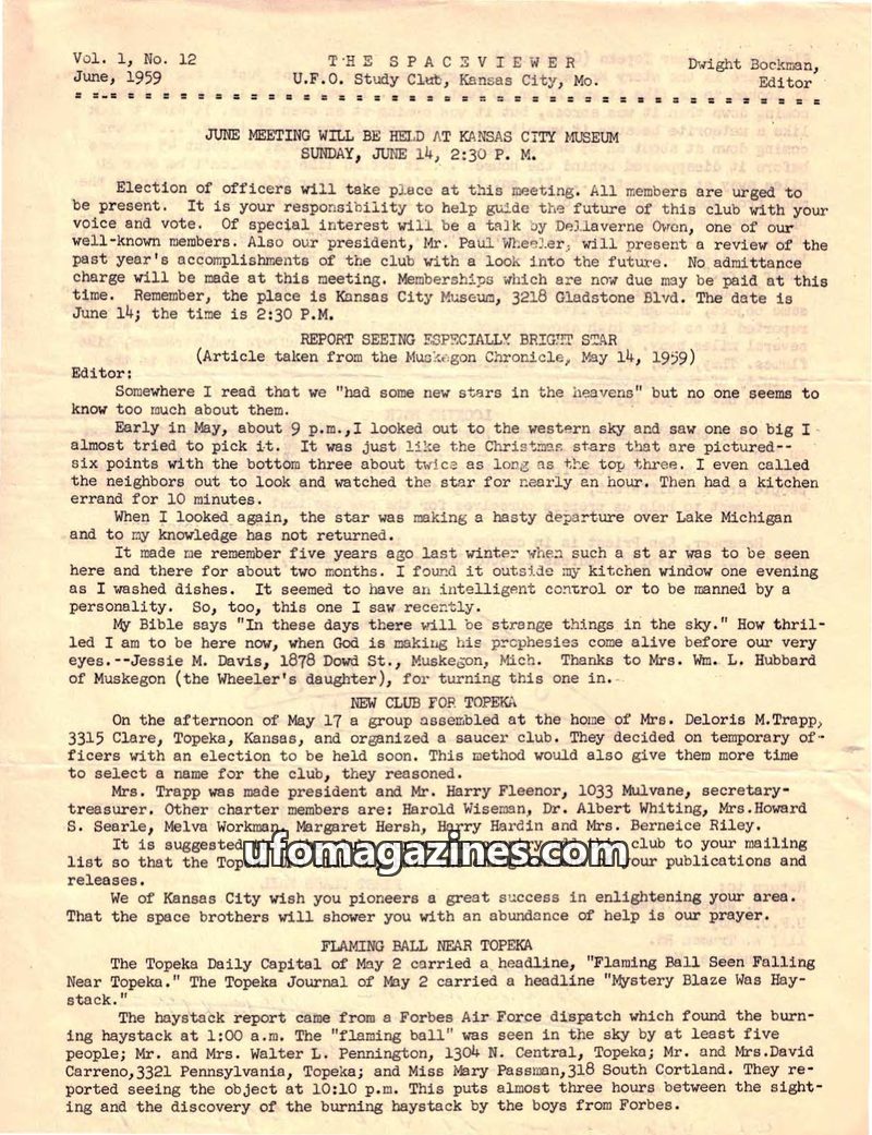 This issue of The Space Viewer from June 1959 announces an upcoming meeting for the Kansas City UFO Study Club, including an election of officers and a talk by Dellaverne Owen. It