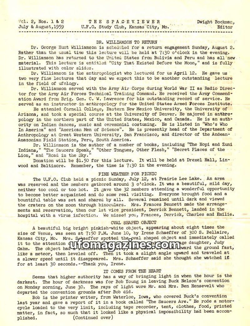 This issue of The Spaceviewer from July-August 1959 covers an upcoming lecture by anthropologist Dr. George Hunt Williamson on his research in Bolivia and Peru. It details a U.F.O.