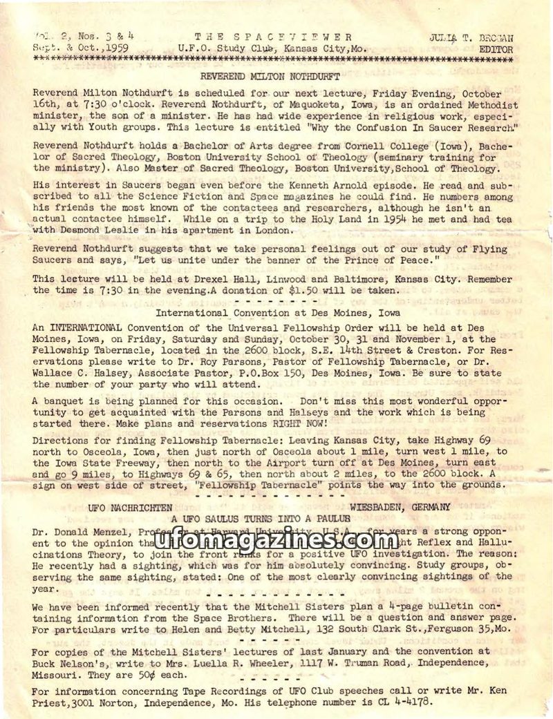 This issue of The Spaceviewer, dated Sept-Oct 1959, covers upcoming lectures by Reverend Milton Nothdurft on 'Why the Confusion In Saucer Research' and an International Convention