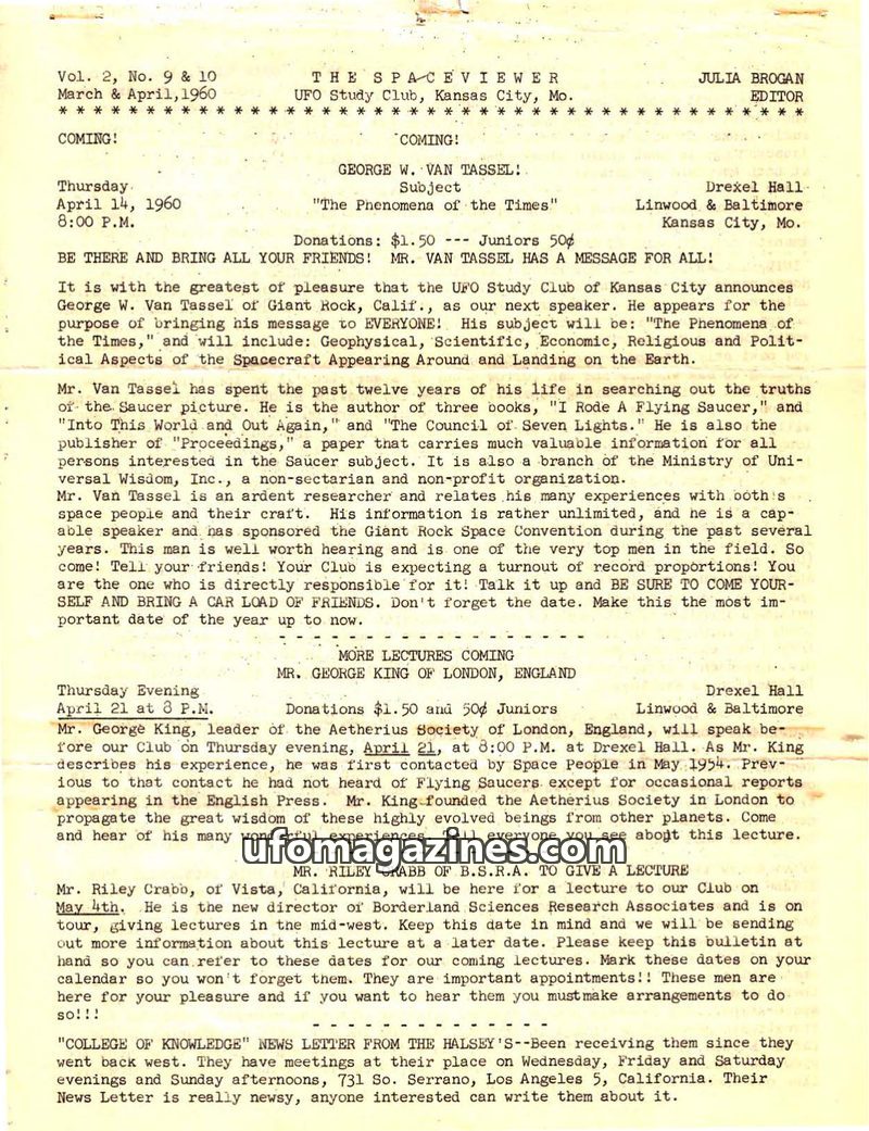This issue of The Spaceviewer, dated March-April 1960, highlights upcoming lectures by UFO researchers George W. Van Tassel and George King. It discusses the growing interest in UF
