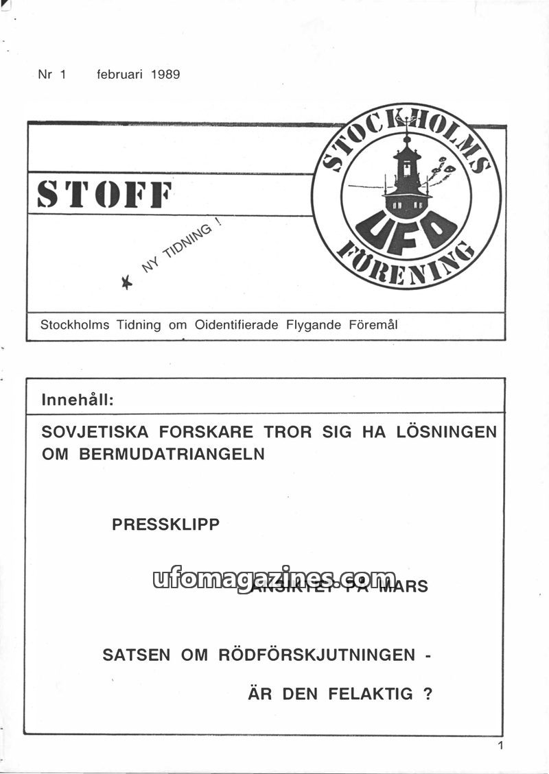 This issue of STOFF, the first from Stockholms UFO-Förening, aims to provide information to members. It covers a range of topics including a potential Soviet solution to the Bermud