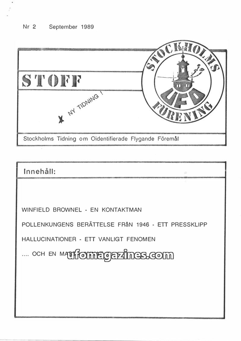 This issue of STOFF, a Swedish UFO magazine, features articles on contactees like Winfield Brownel and Gösta Carlsson, who recount encounters with extraterrestrials and their messa