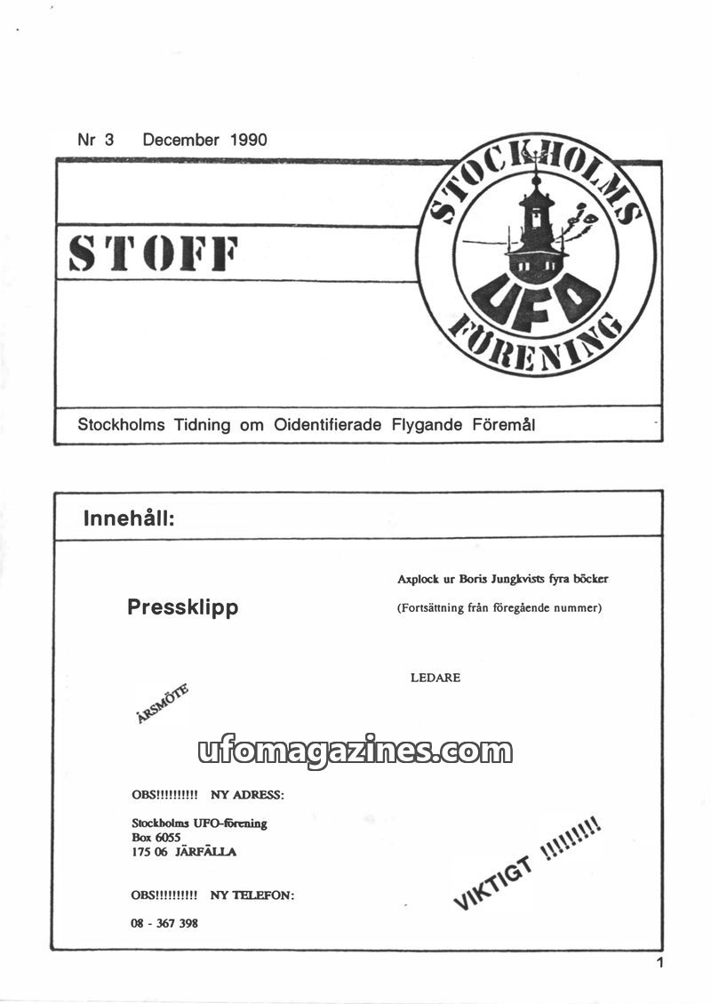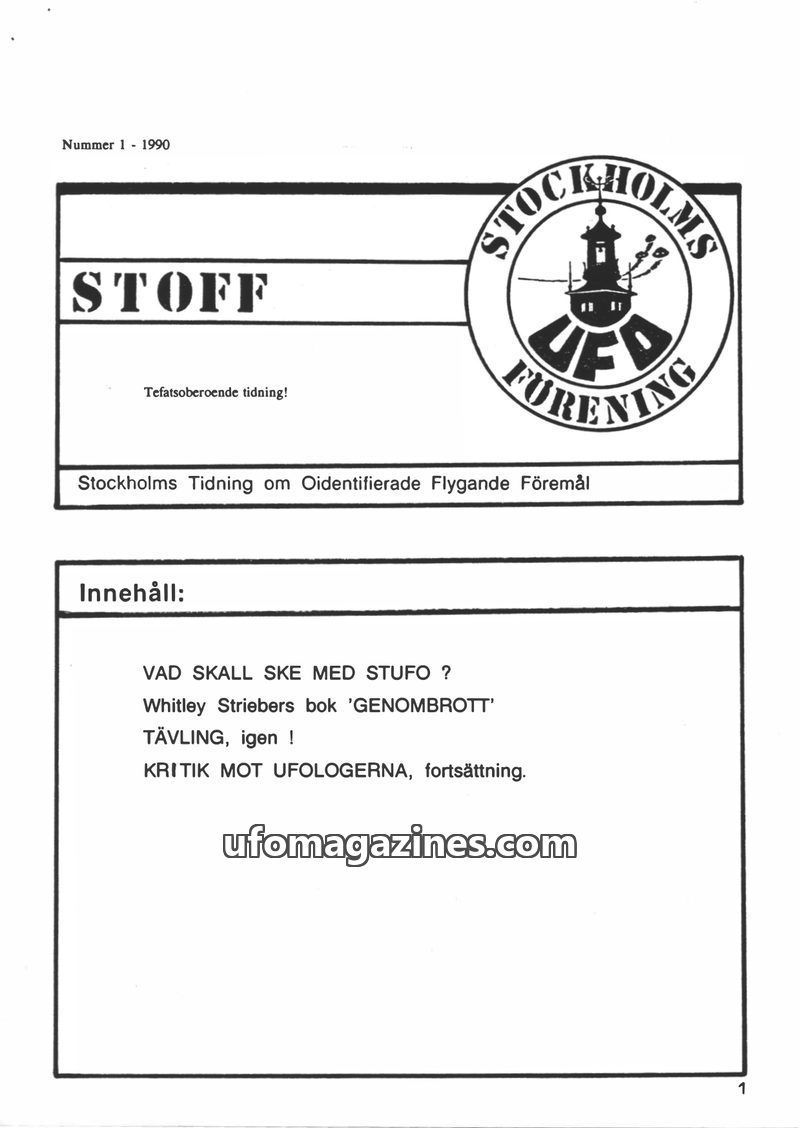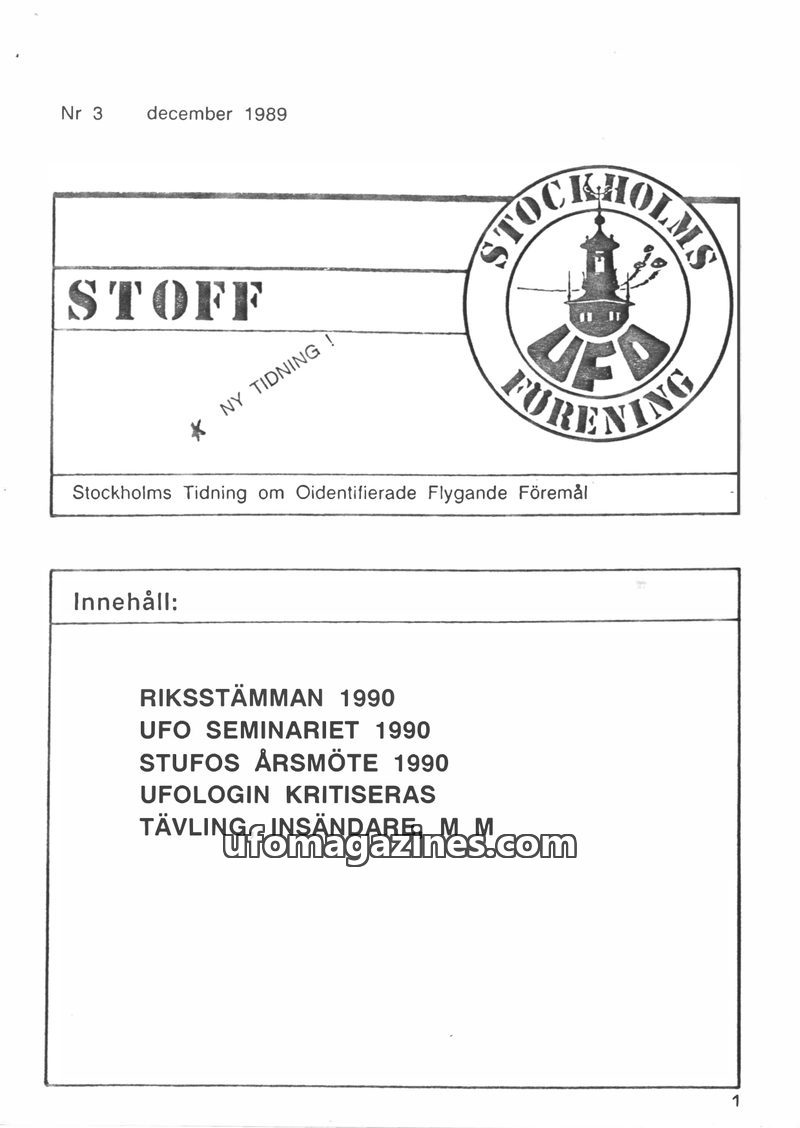 This issue of STOFF, published by STUFO in 1990, focuses on the state of ufology in Sweden, noting a decline in active engagement and a narrow focus on the 'flying saucer' hypothes