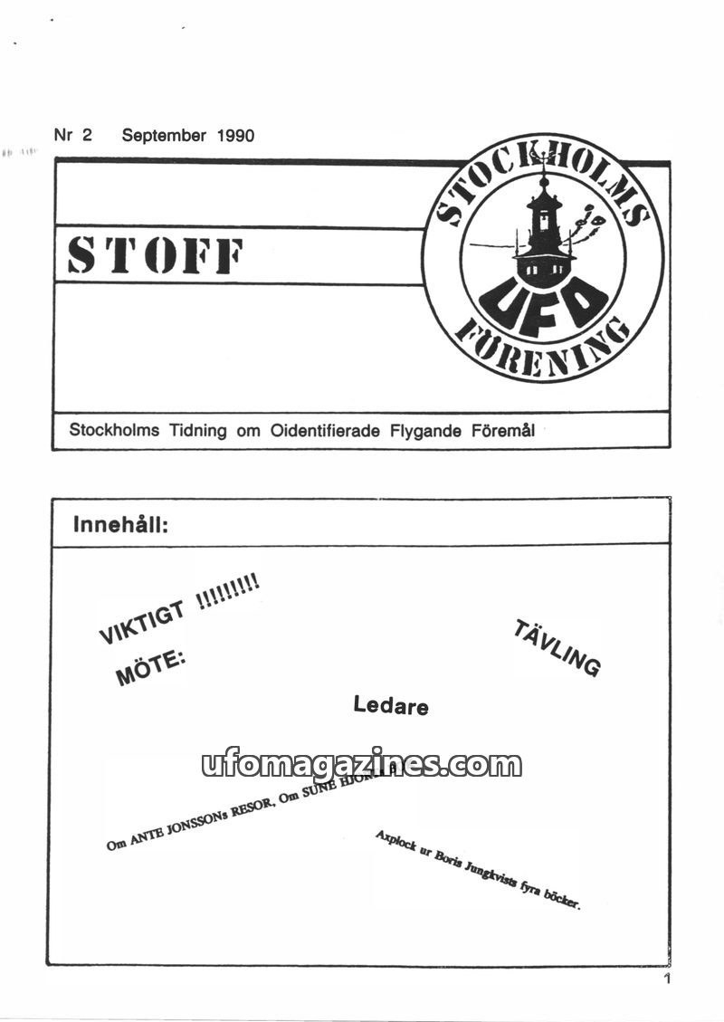This issue of STOFF magazine from September 1990 focuses on UFO phenomena and related topics. It includes articles detailing personal UFO experiences, such as those of Ante Jonsson