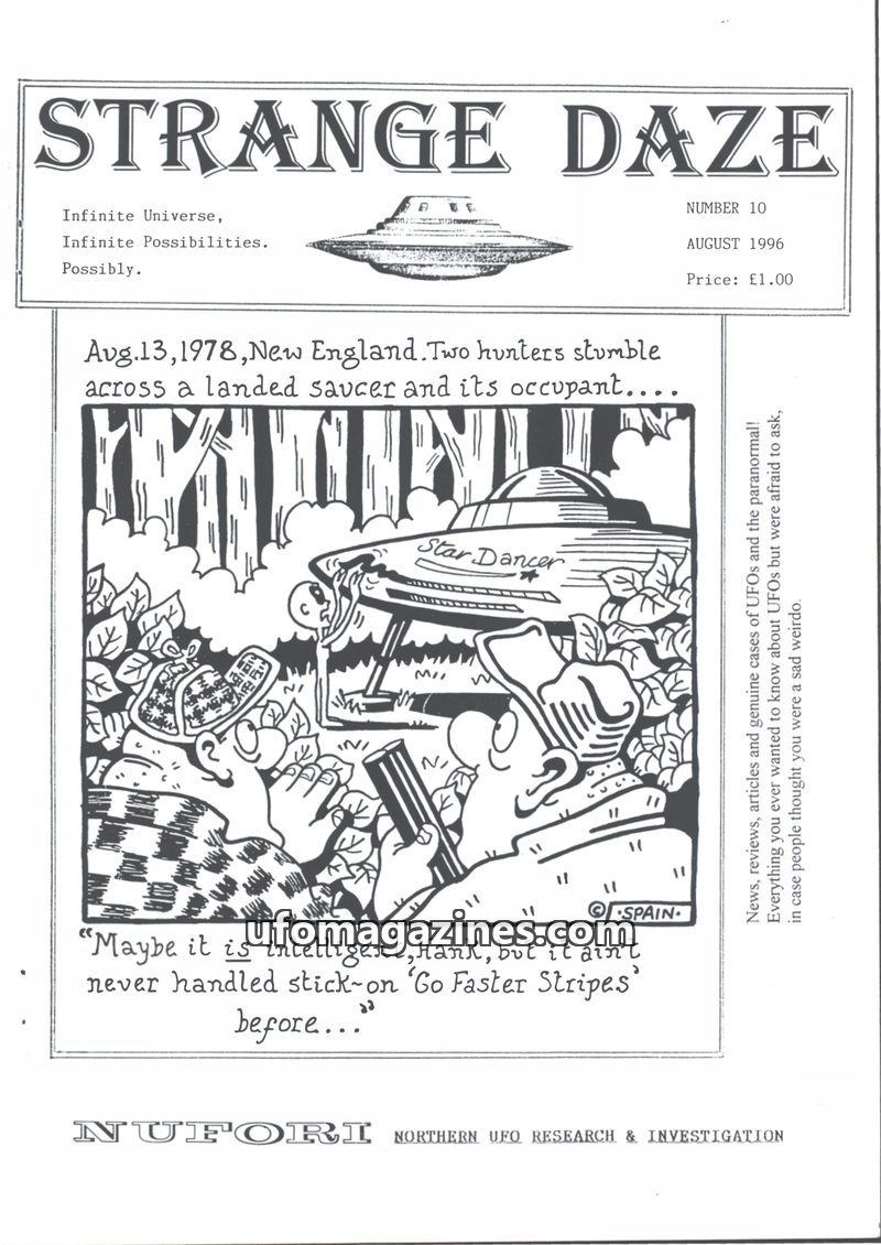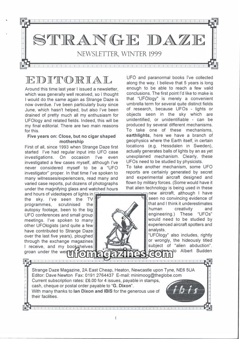 This issue of Strange Daze Newsletter marks the final editorial by Dave Newton, who expresses disillusionment with UFOlogy's lack of progress and its tendency to be a 'fringe subje