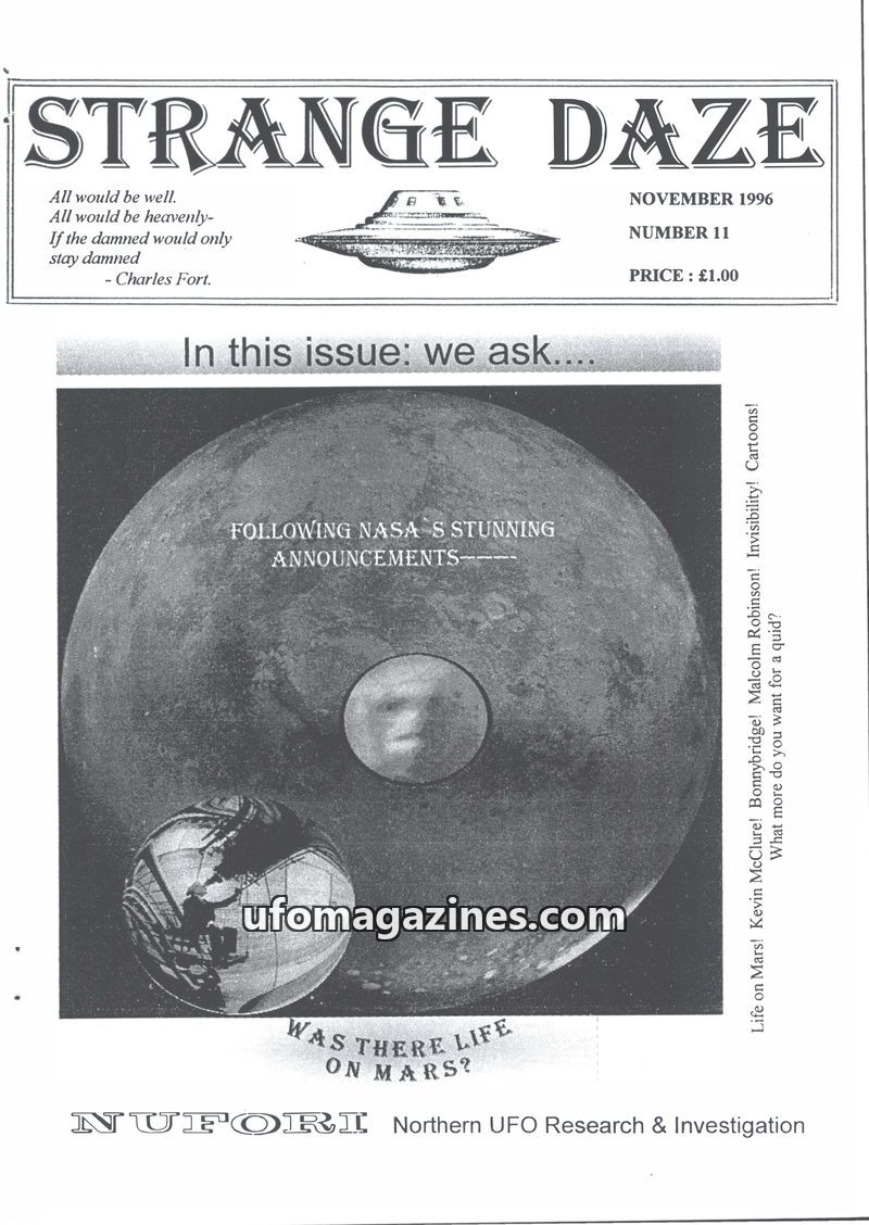 This issue of Strange Daze, published in November 1996, features articles on the potential for ancient life on Mars based on meteorite evidence, a discussion on the nature of close