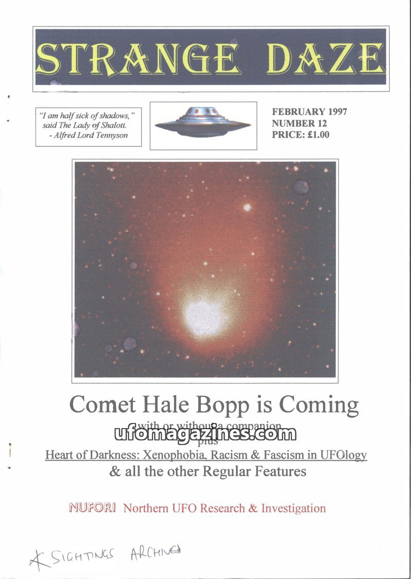 This issue of Strange Daze magazine from February 1997 focuses on Comet Hale-Bopp, debunking sensationalist claims of a 'Saturn Like Object' companion. It also delves into UFO sigh