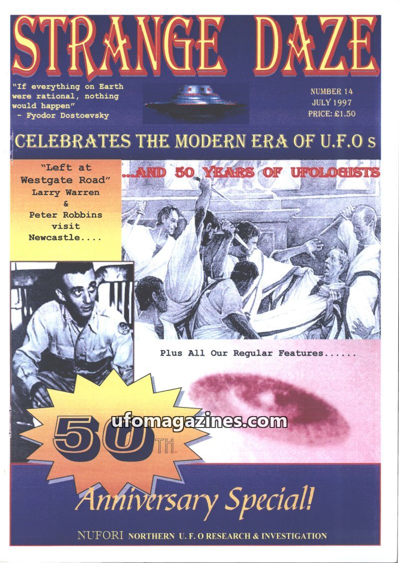 This issue of Strange Daze, number 14 from July 1997, marks the 50th anniversary of the modern UFO era, originating from Kenneth Arnold's 1947 sighting. It features retrospective c