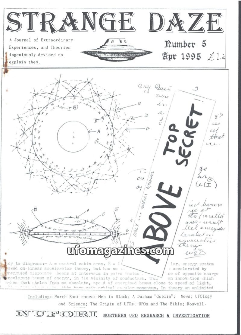 This issue of Strange Daze, published by NUFORI, covers a range of UFO and paranormal topics. It includes an editorial discussing the current hype around UFOs and the potential pit