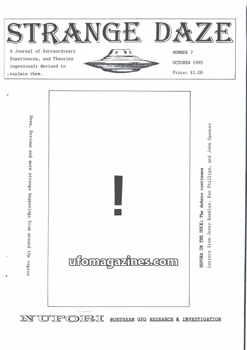 This issue of Strange Daze, published in October 1995, features a cover story on the BUFORA debate with contributions from Jenny Randles, Ken Phillips, and John Spencer. The editor