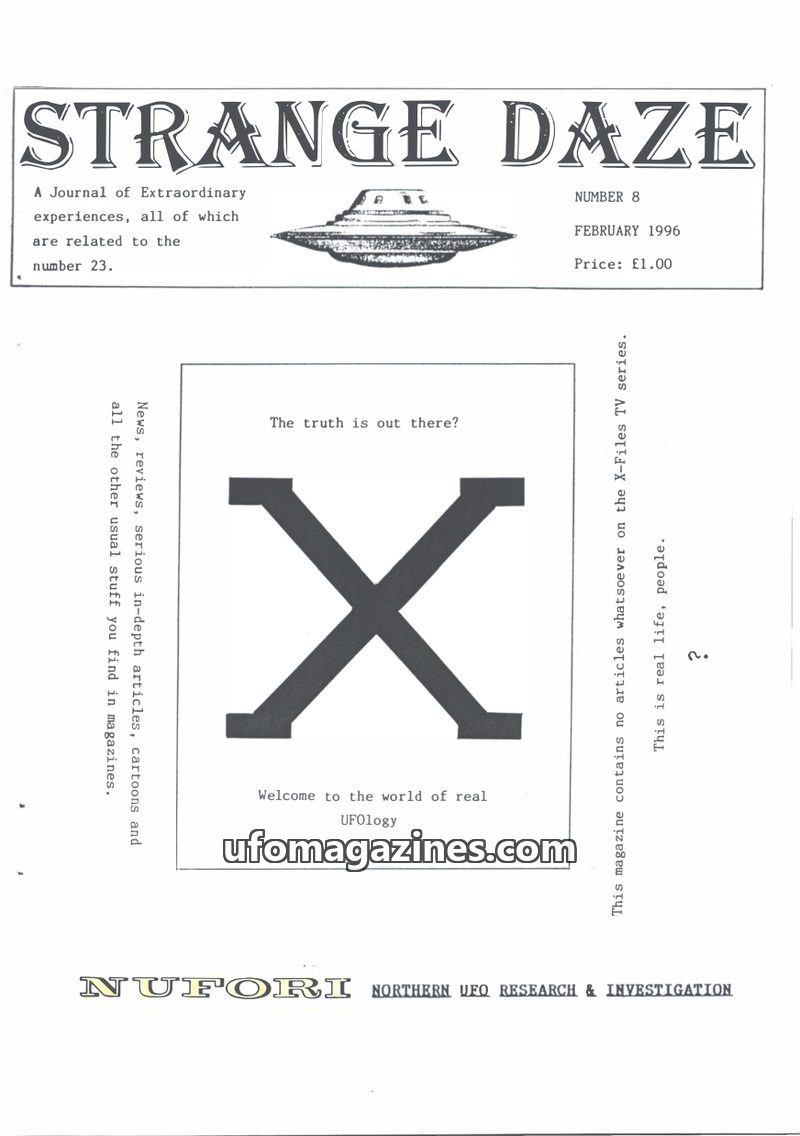 Strange Daze, Issue 8 (February 1996), published by NUFORI, focuses on UFOlogy with articles on the Roswell incident, extraterrestrial intelligence, and regional sightings. The edi