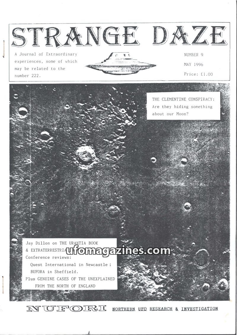 This issue of Strange Daze (May 1996) focuses on UFOlogy and paranormal research, featuring articles on 'The Clementine Conspiracy' concerning the Moon, and 'The Urantia Book & Ext