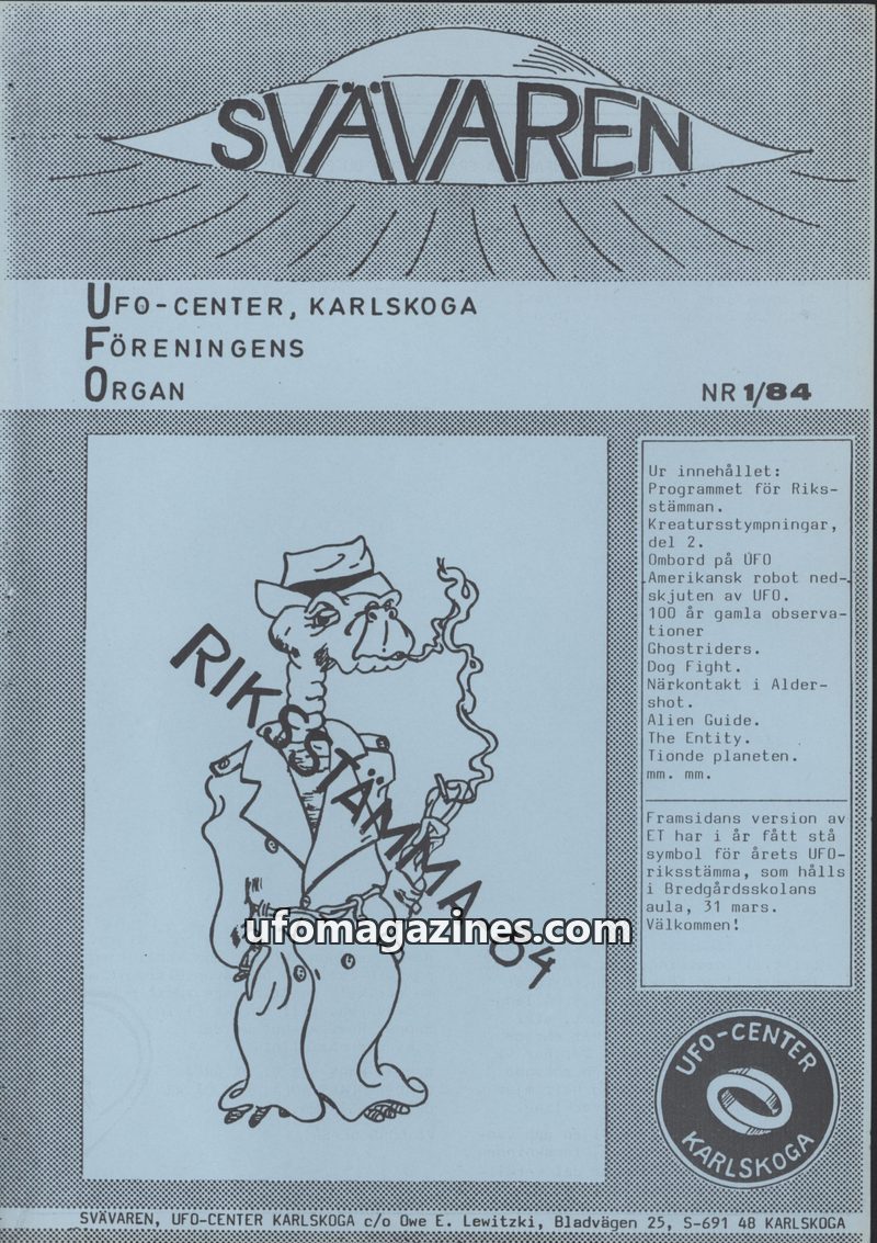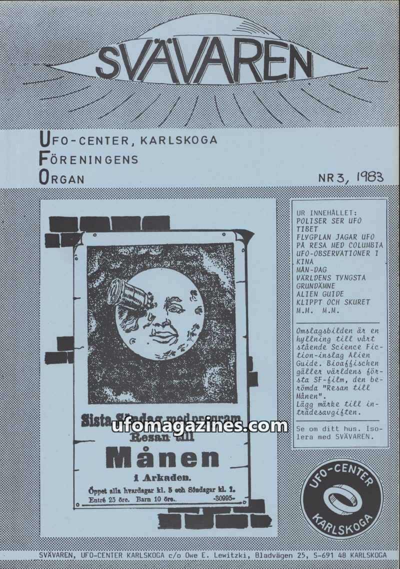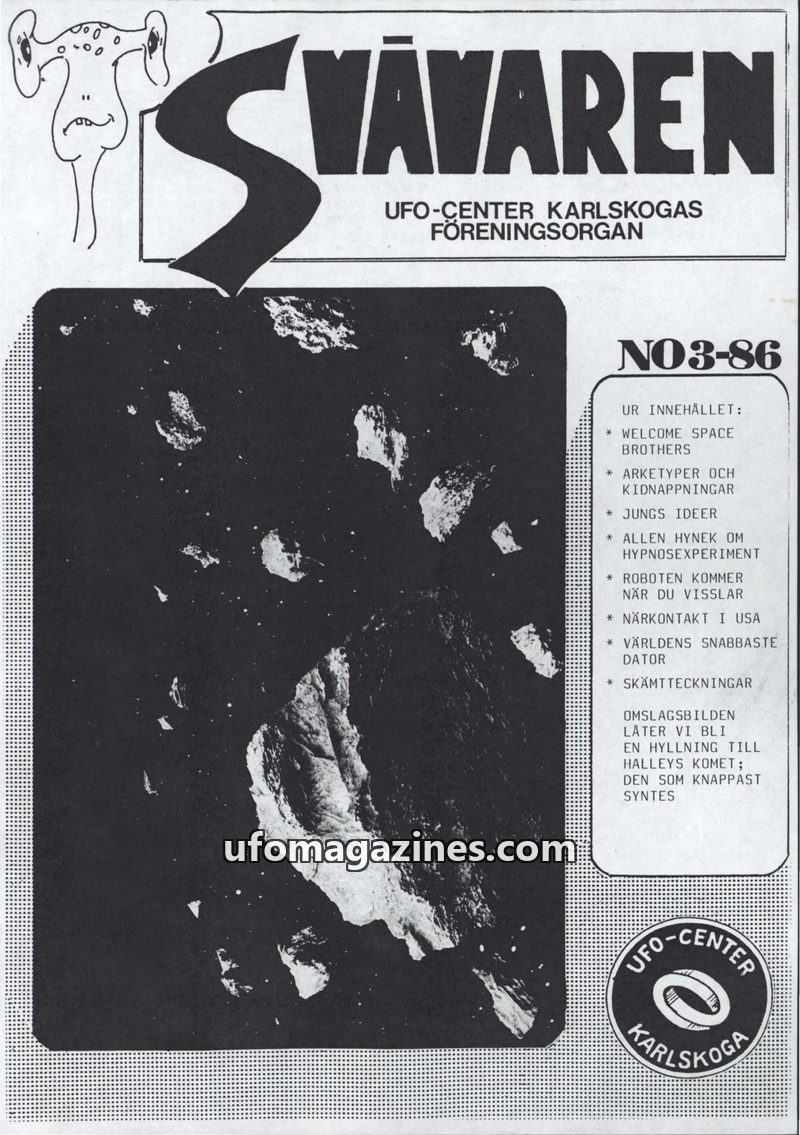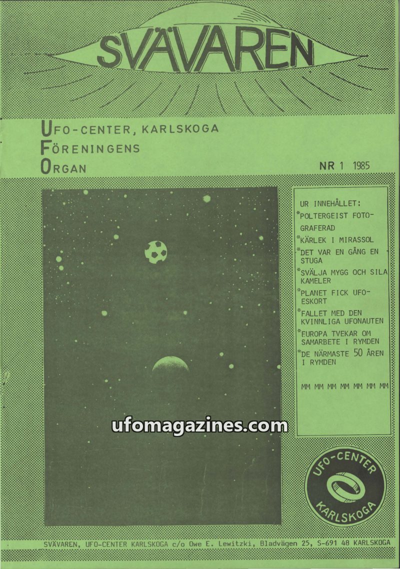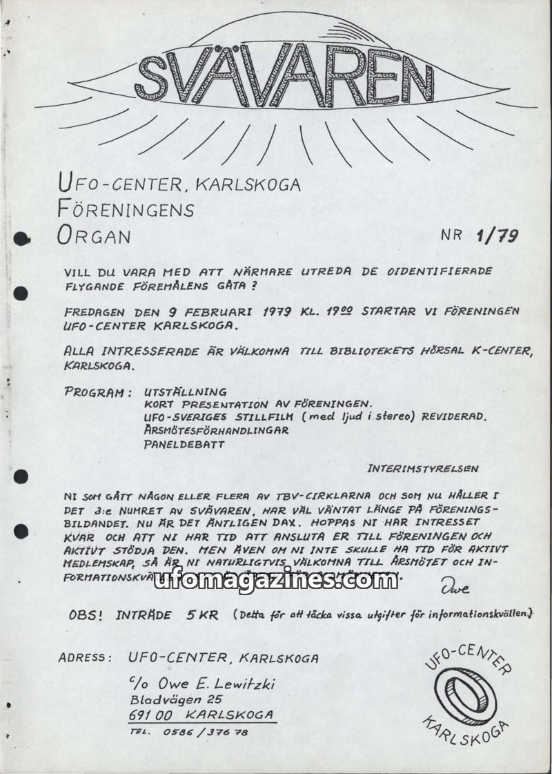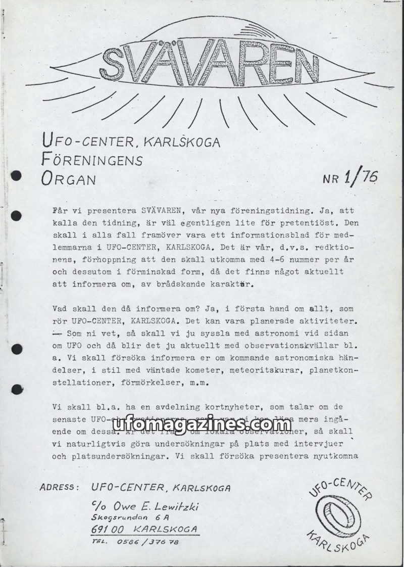 This issue introduces 'SVÄVAREN', the new publication from UFO-CENTER, Karlskoga, intended as an information bulletin for members. It announces upcoming astronomy observation night