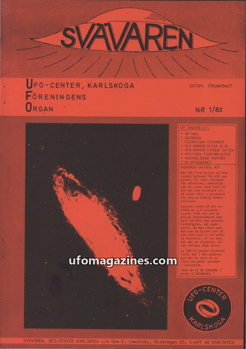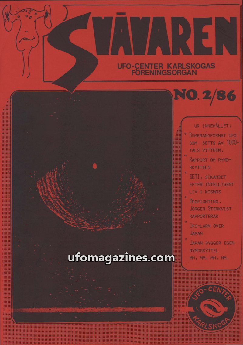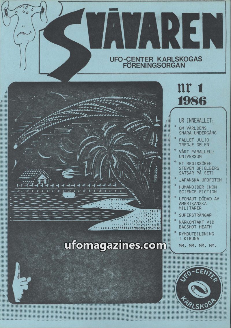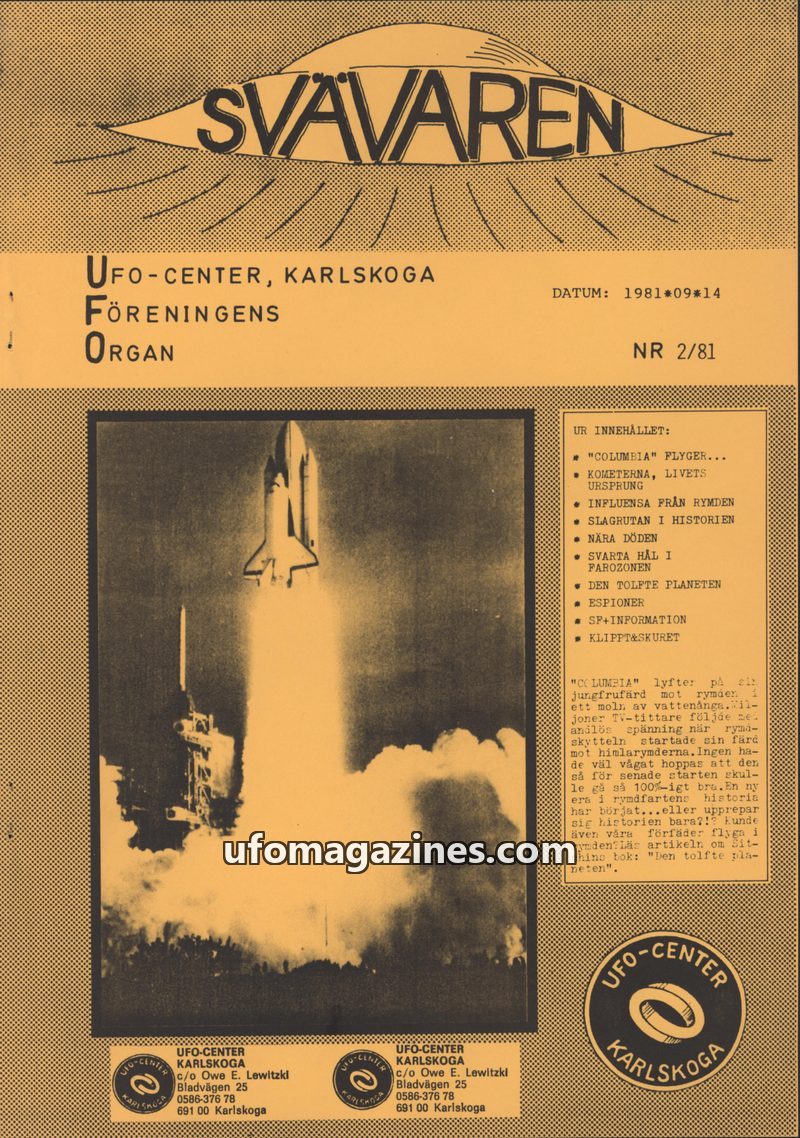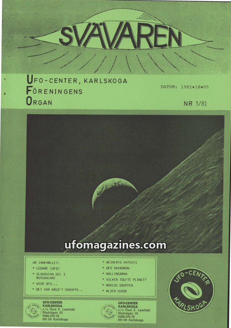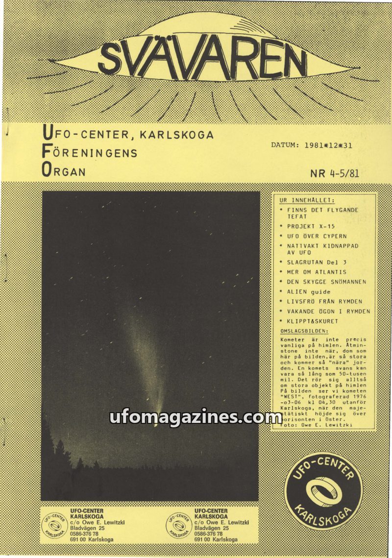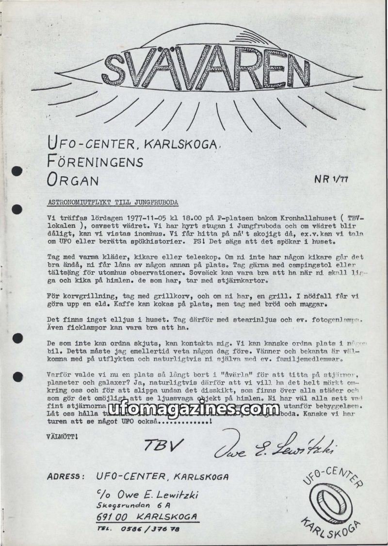 This issue introduces 'SVÄVAREN', the new publication from UFO-CENTER, Karlskoga, intended as an information bulletin for members. It announces upcoming astronomy observation night