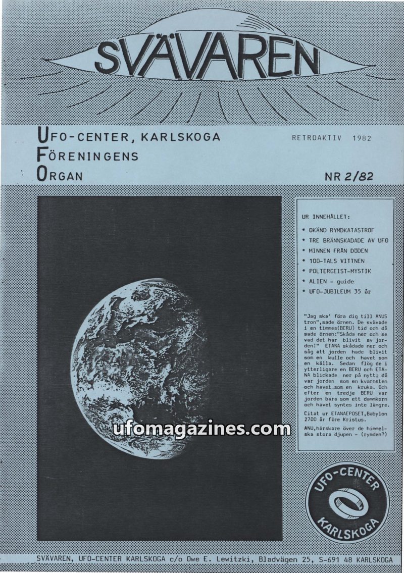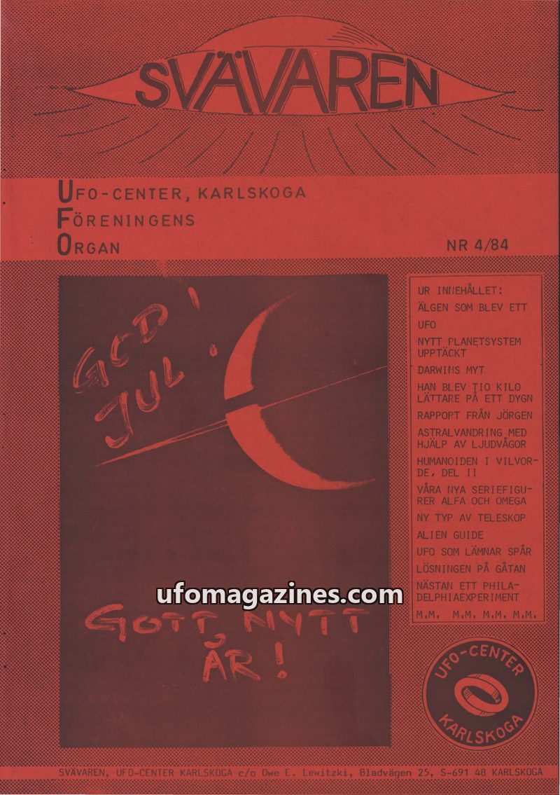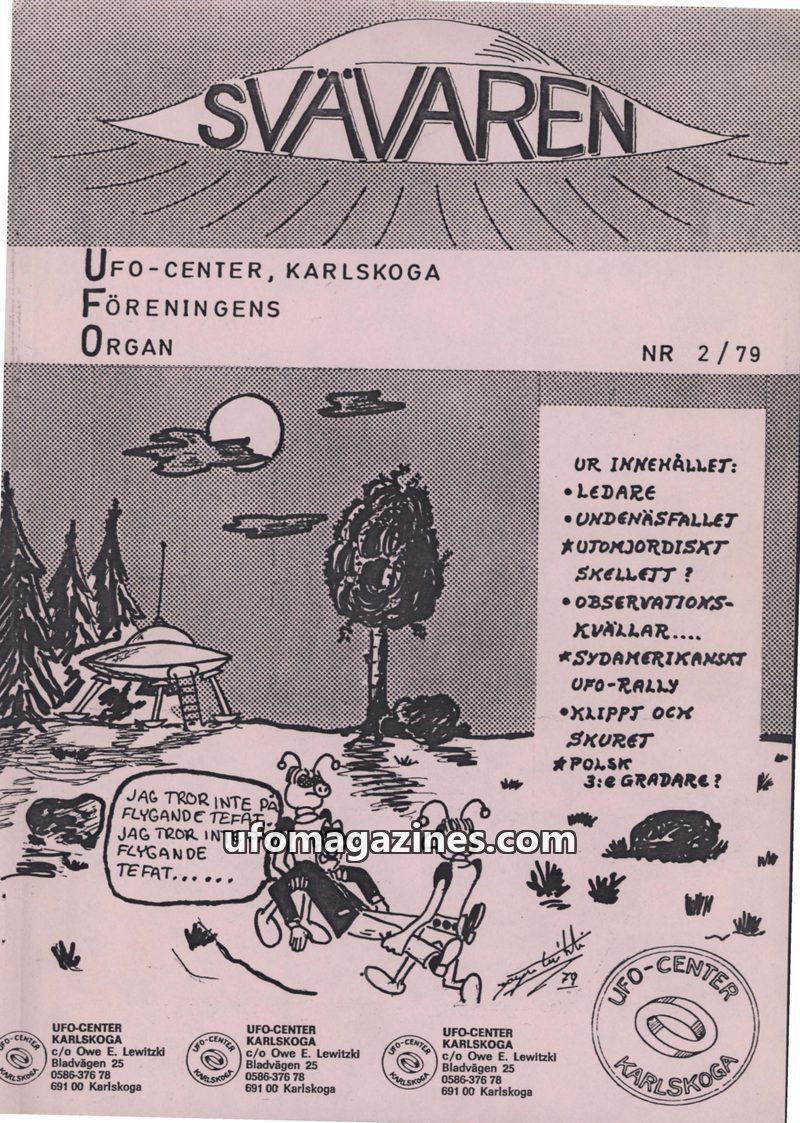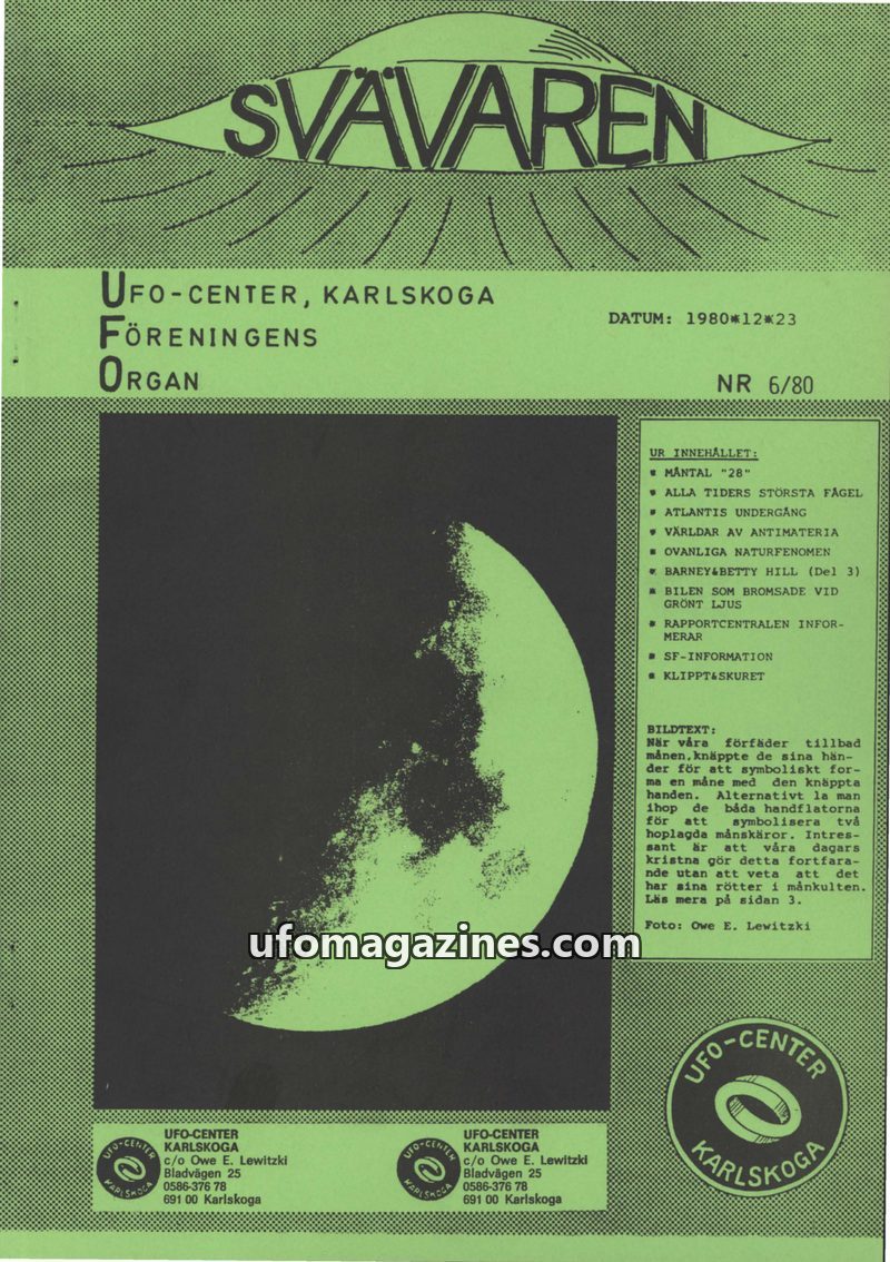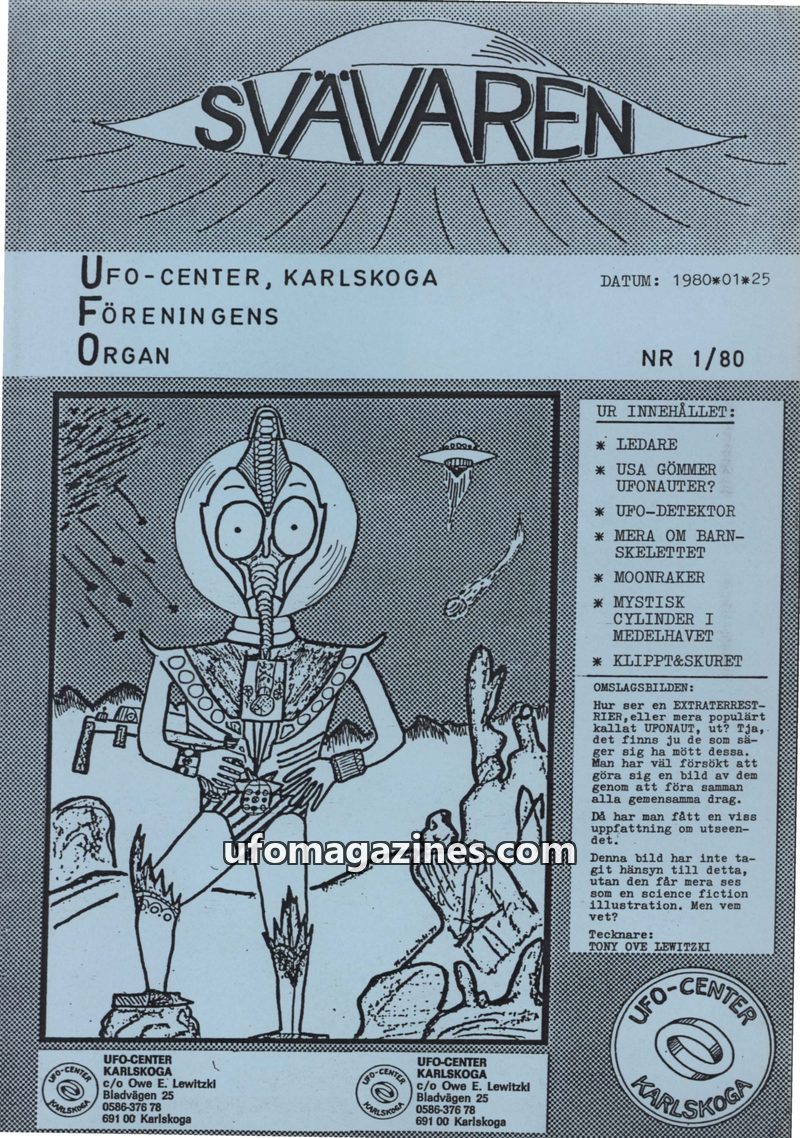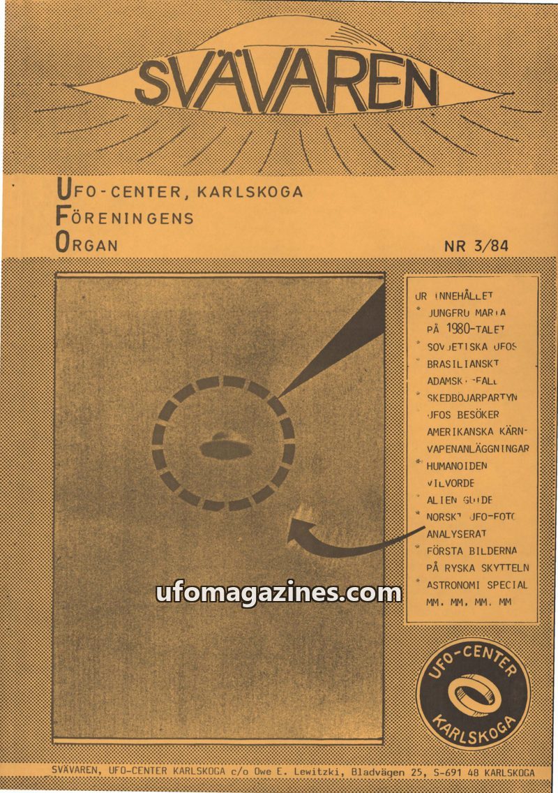 This issue introduces 'SVÄVAREN', the new publication from UFO-CENTER, Karlskoga, intended as an information bulletin for members. It announces upcoming astronomy observation night