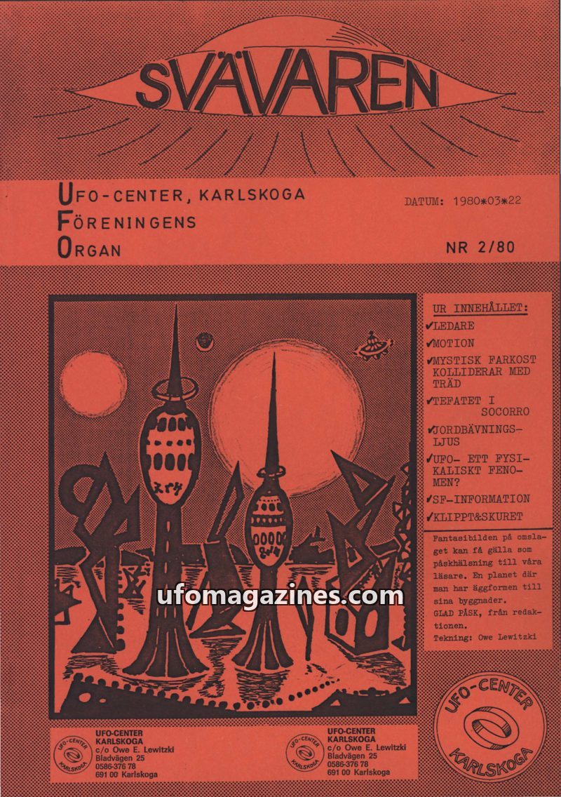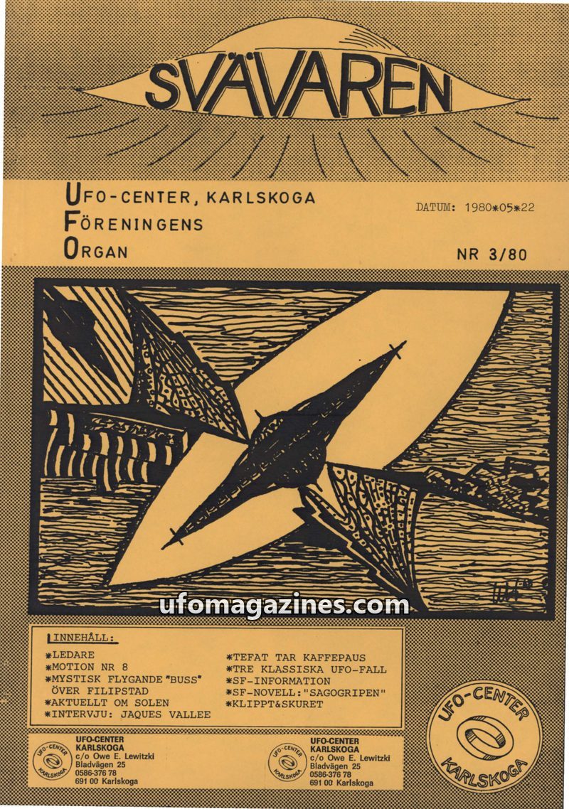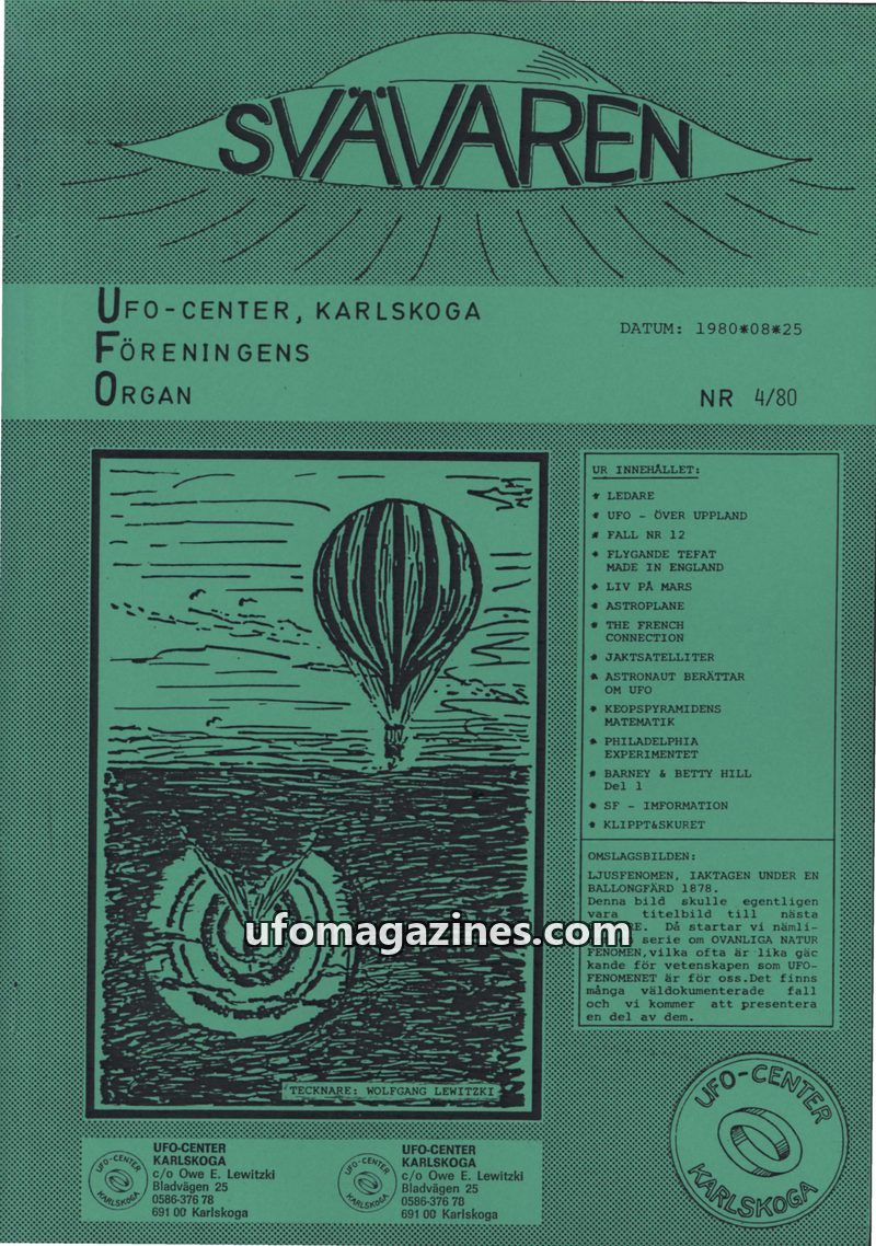 This issue of Svavaren, published by UFO-Center Karlskoga in August 1980, covers various UFO-related topics. It includes witness accounts of sightings in Sweden and Spain, a report