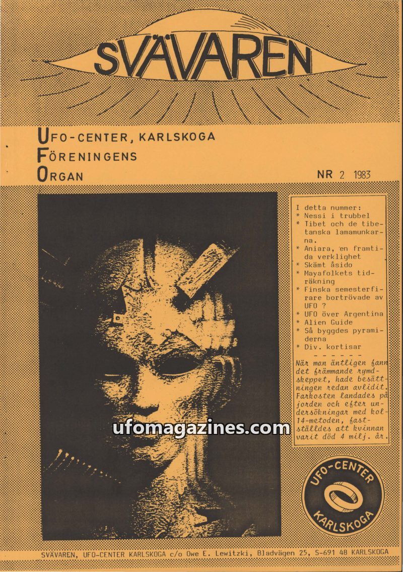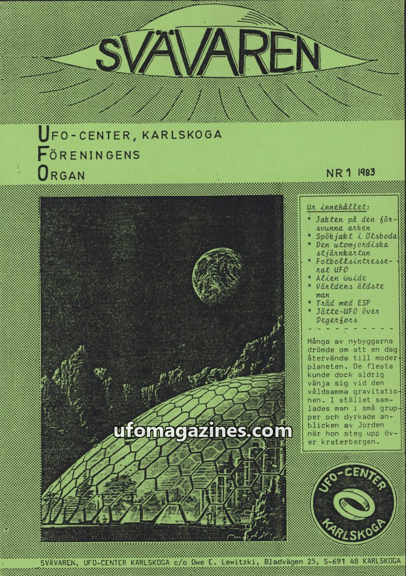 This issue of SVAVAREN, published by UFO-Center Karlskoga in 1983, covers a range of topics including a UFO incident in Senegal, the ongoing search for the Ark of the Covenant, and