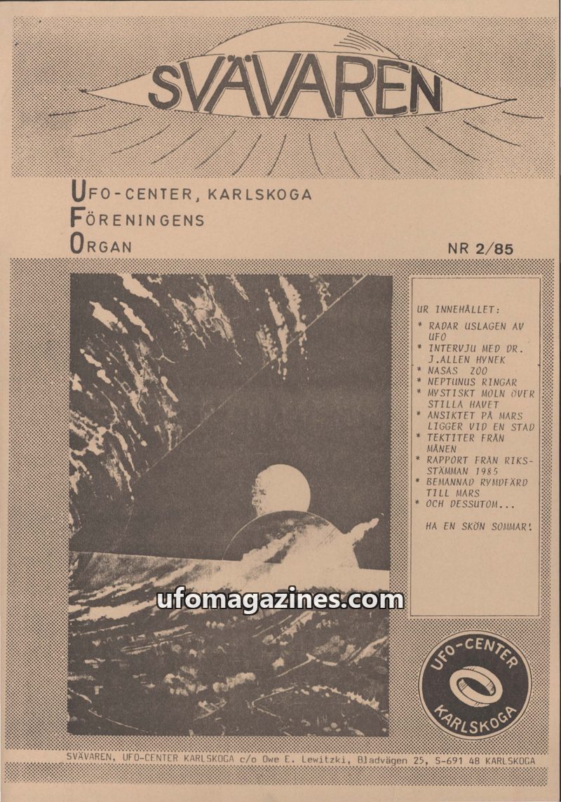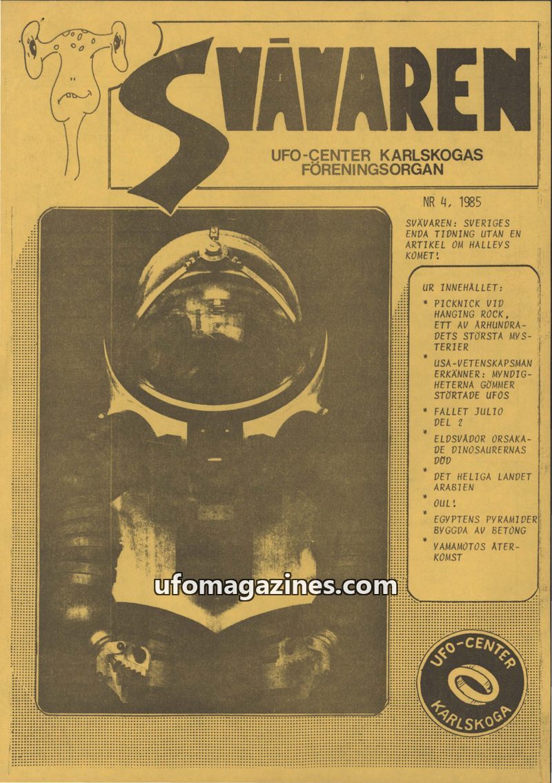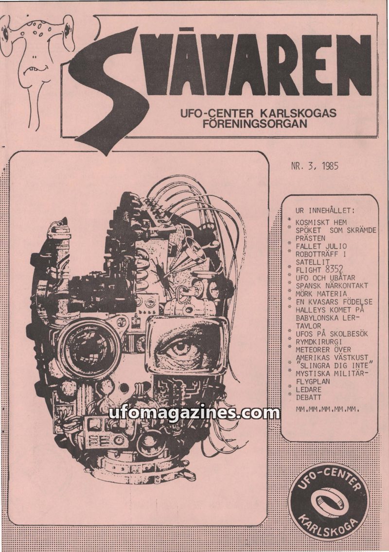 This issue of Svavaren magazine, published by UFO-Center Karlskoga in 1985, delves into various aspects of the UFO phenomenon. It features an editorial reflecting on the organizati