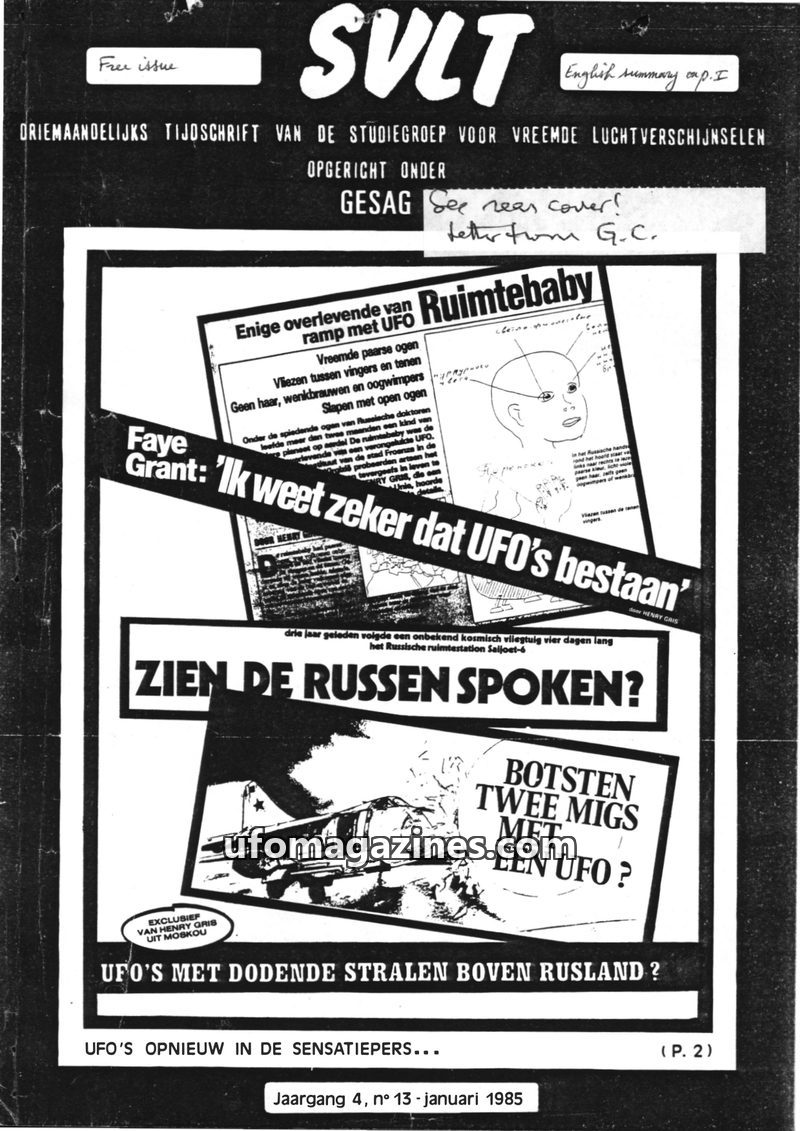 This issue of SVLT magazine delves into various UFO-related topics. It discusses the controversial claims of writer Henry Gris regarding a 'space baby' in Russia and questions his