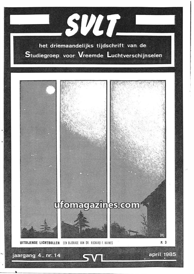 This issue of SVLT, a Dutch-language magazine for the study of strange aerial phenomena, features an article by physicist Dr. Richard F. Haines on 'Expanding Light Balls' (EBLs), a